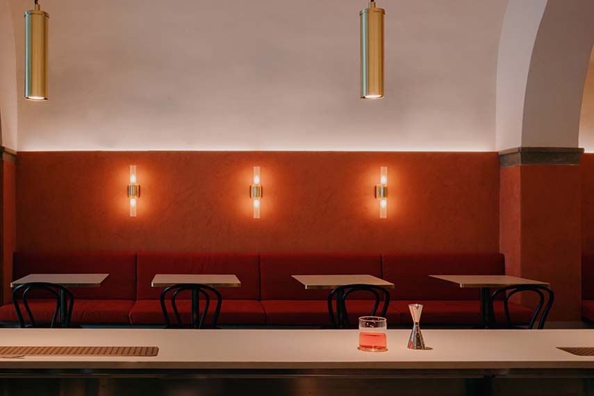 A former boat storage facility in the wool processing district of Oltrarno in Florence undergoes a transformation, thanks to the design by AFS a architecture studio, characterized by warm materials and a delicate color palette, into the new Piazza del Tiratoio cocktail bar. The welcoming atmosphere created by the use of lime plaster, black terracotta, and brushed brass accents guides patrons through their mixology experience without overwhelming them