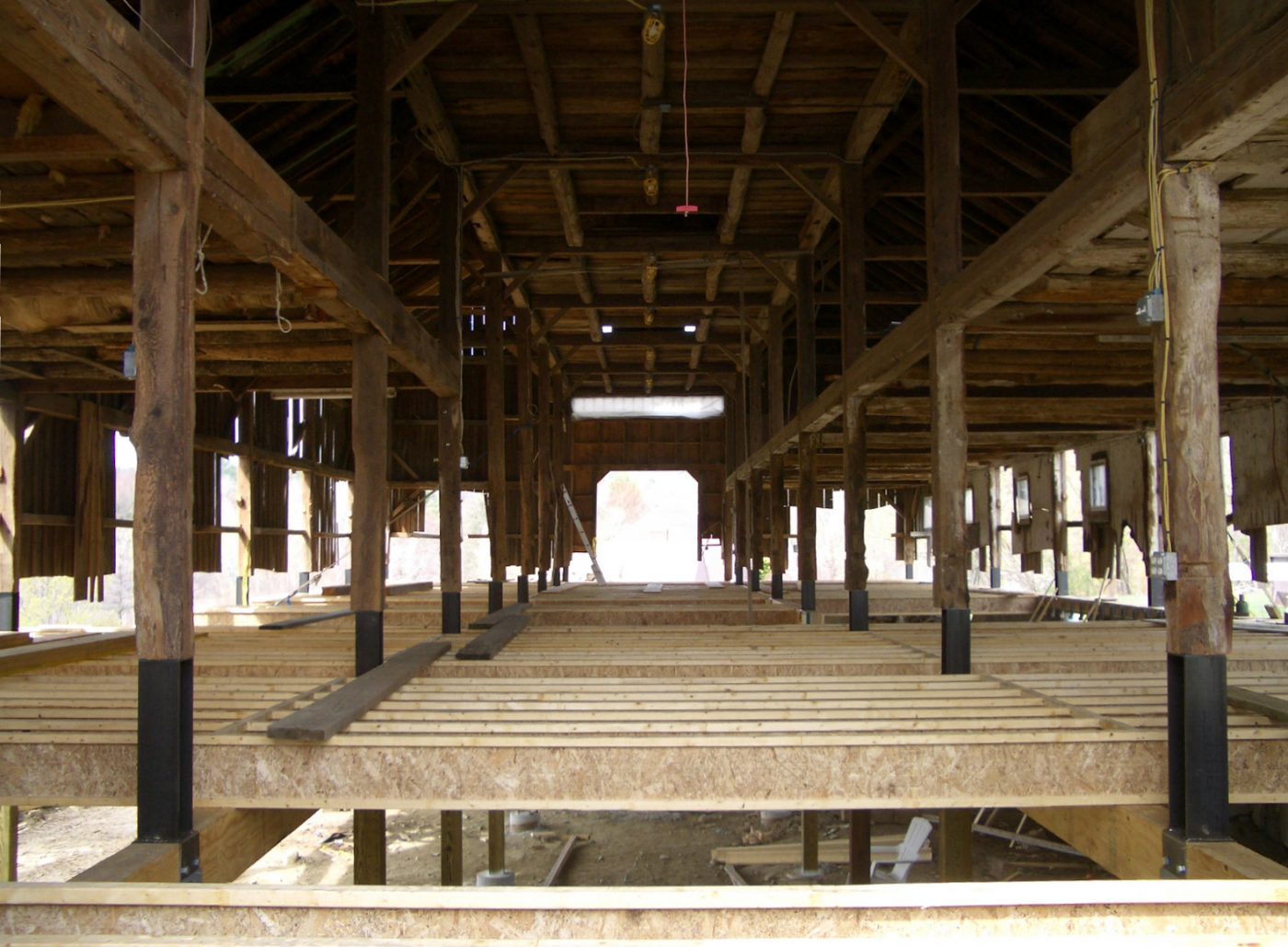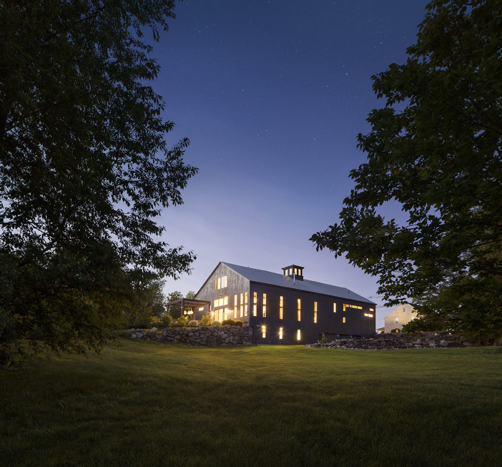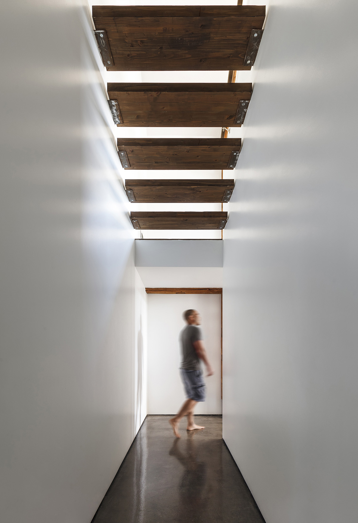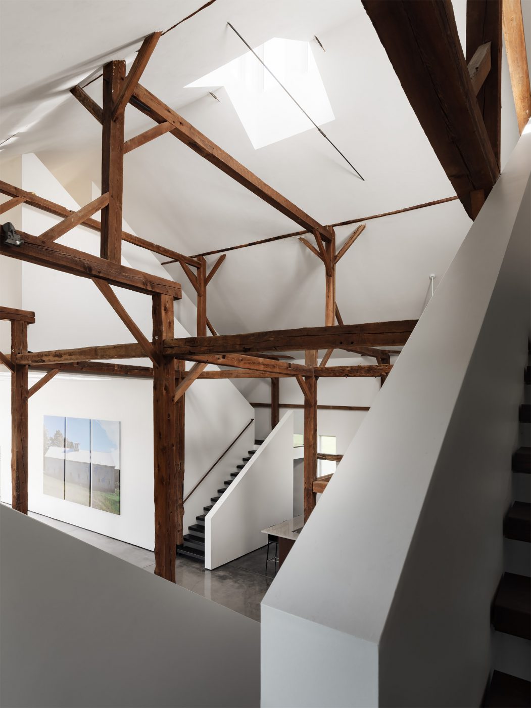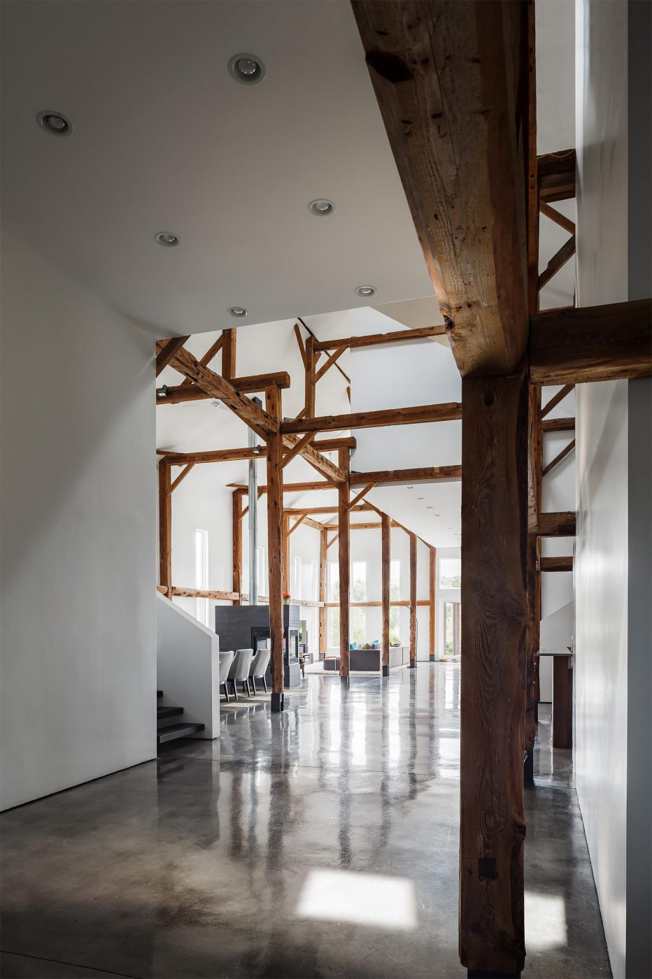 A 150-year-old abandoned barn in the United States is converted into a loft with en-suite bedrooms, wardrobes and floors made of polished concrete and characterized by white and solid wood volumes that define the spaces