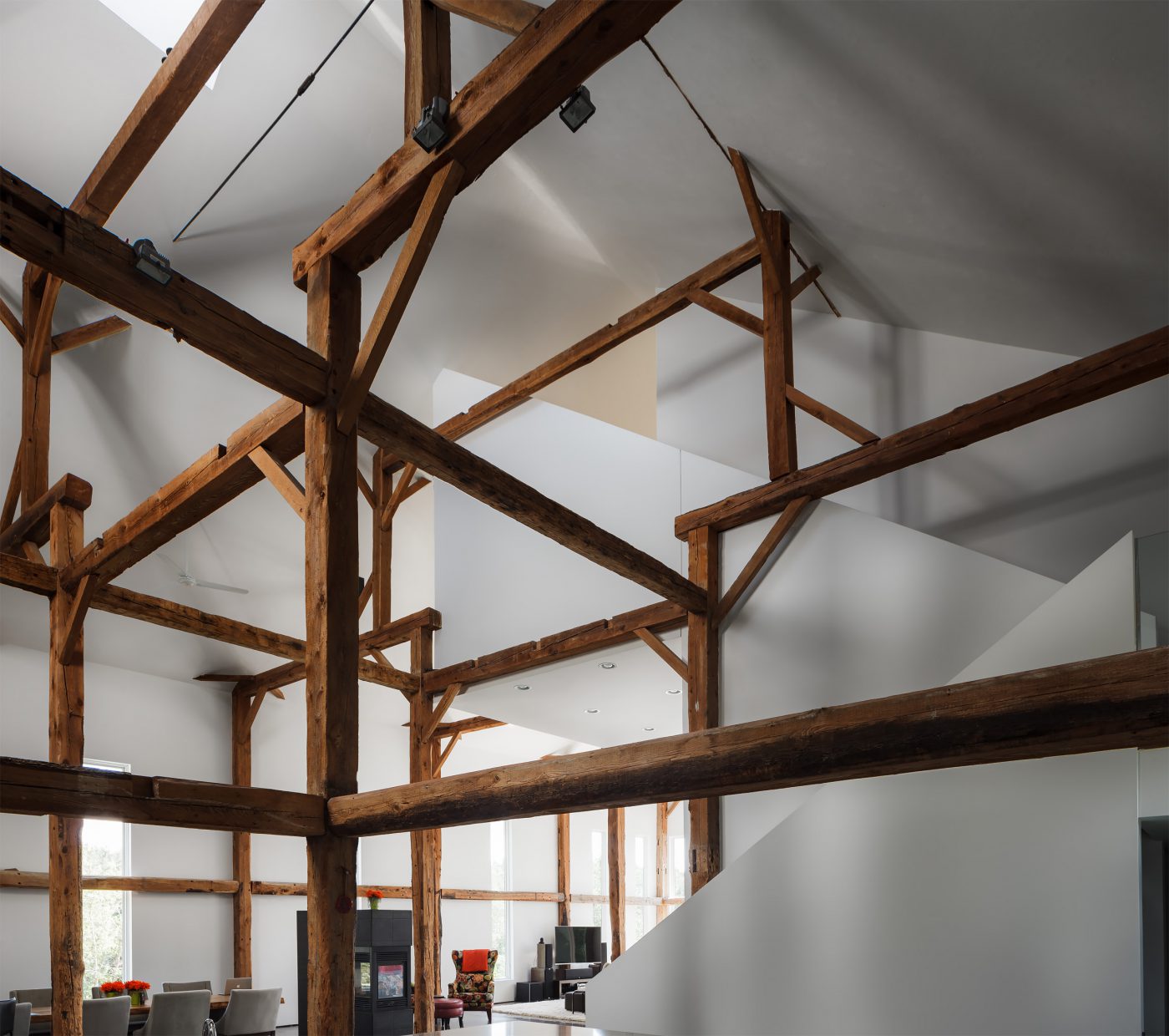 The solid wood structure is left exposed and the pillars and beams, together with the white volumes, determine the spaces, creating living spaces and preserving the original staircase