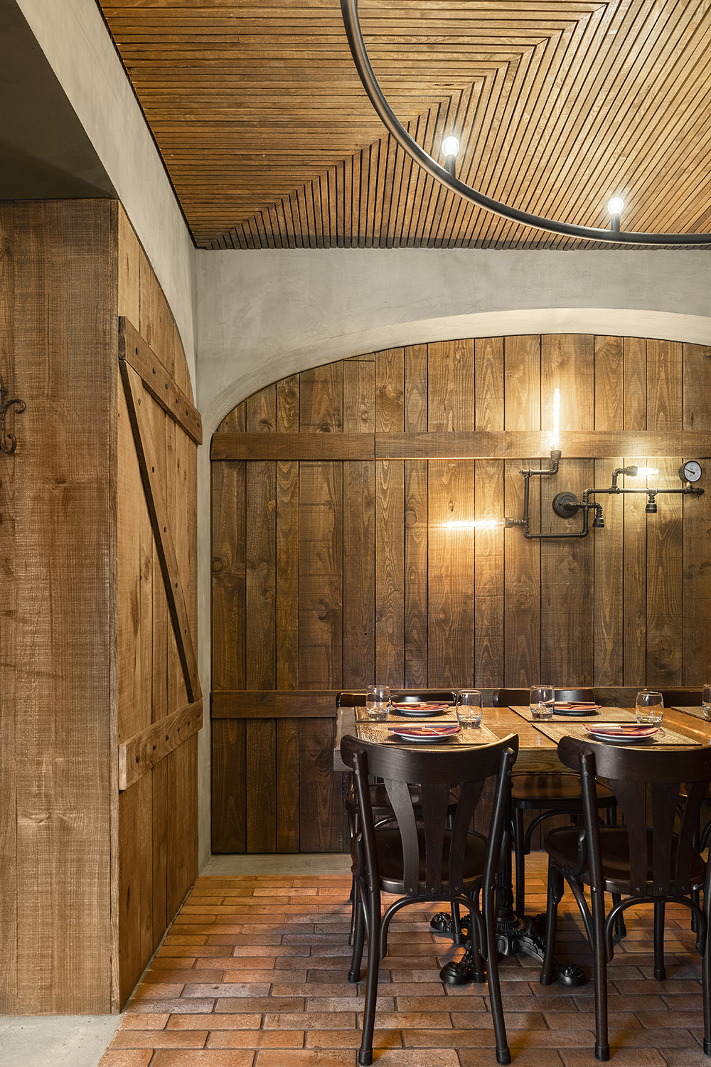 The cellar of a building is renovated to accommodate a restaurant and structured materials, dark colors, and pine wood are used to manage one of the most common problems of restaurants, the sound of reverberation