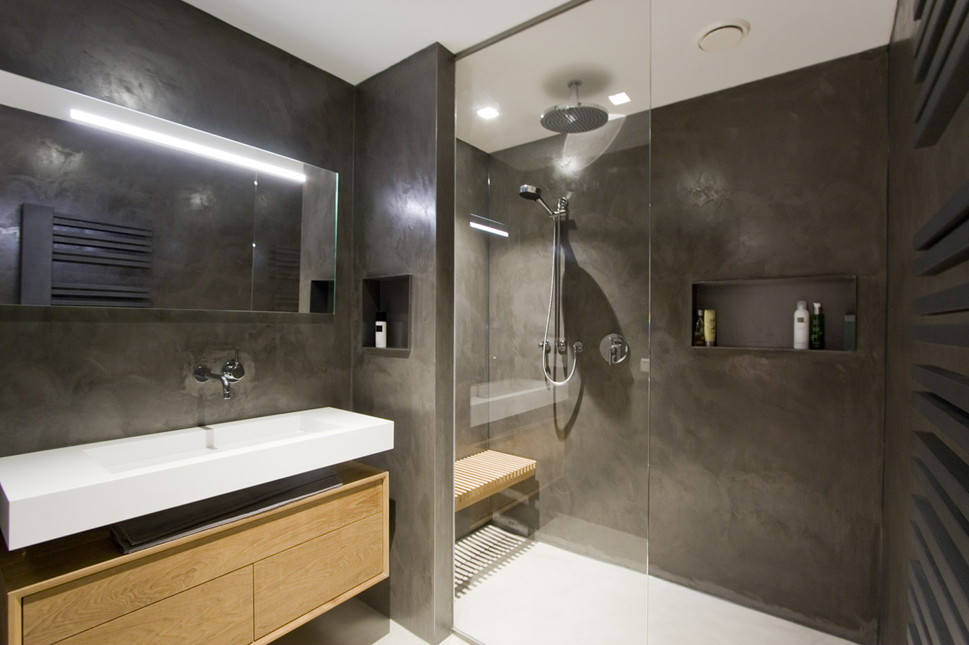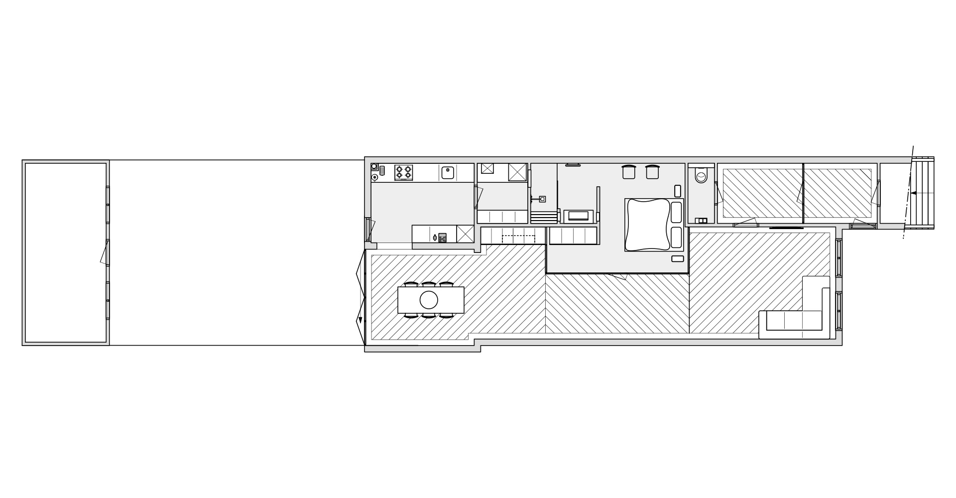 The renovation of "Bedroom in the middle" is designed and led by Amsterdam-based architecture firm Robbert de Goede. The designers choose to eliminate all pre-existing partitions and make a wide 3-meter opening in the load-bearing wall in the middle of the apartment. From this new opening they are able to create a large central bedroom with a dedicated bathroom