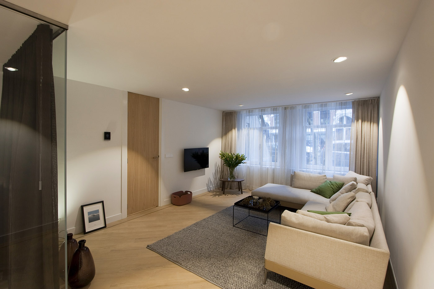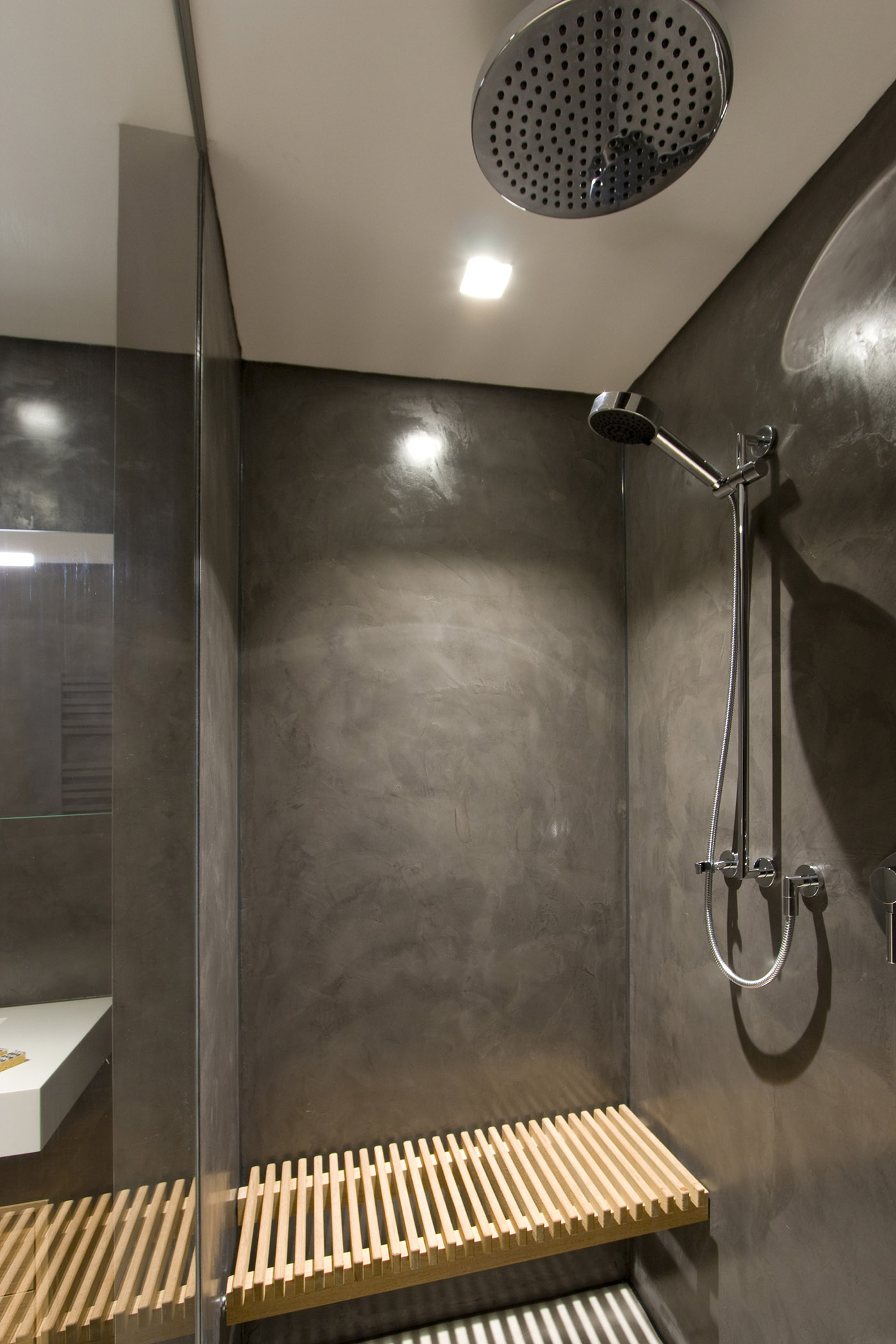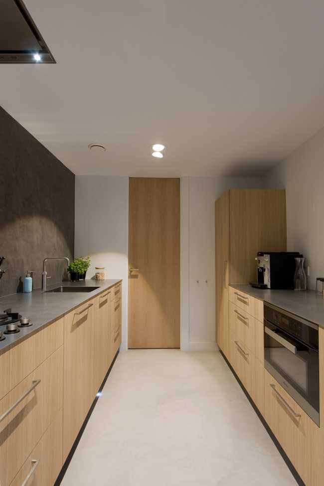 Glazed walls rising from floor to ceiling, as well as wood cabinets and full-height doors, give the perception of a higher space and make the design more linear and elegant. The Occhio lights, recessed into the ceiling, provide excellent illumination, and the darkness of the old apartment remains just a memory anymore. Other technical features include underfloor heating and a controlled ventilation system that allows optimal air exchange even in the closed bedroom