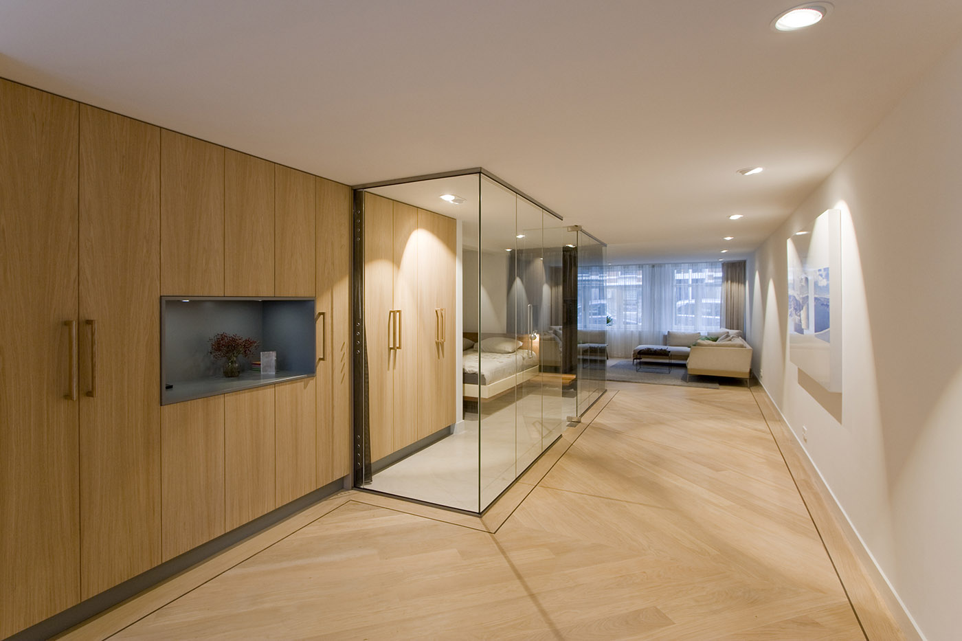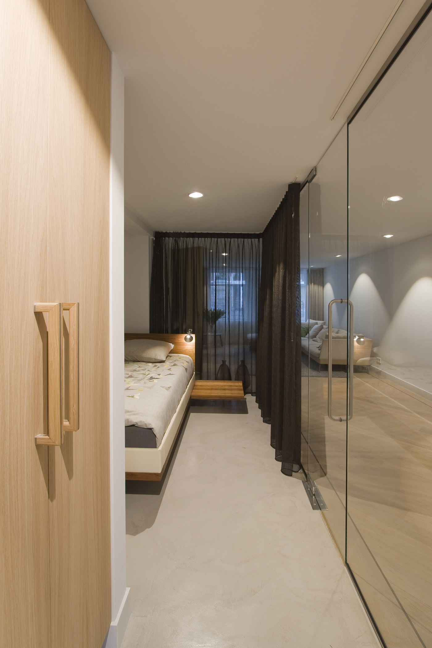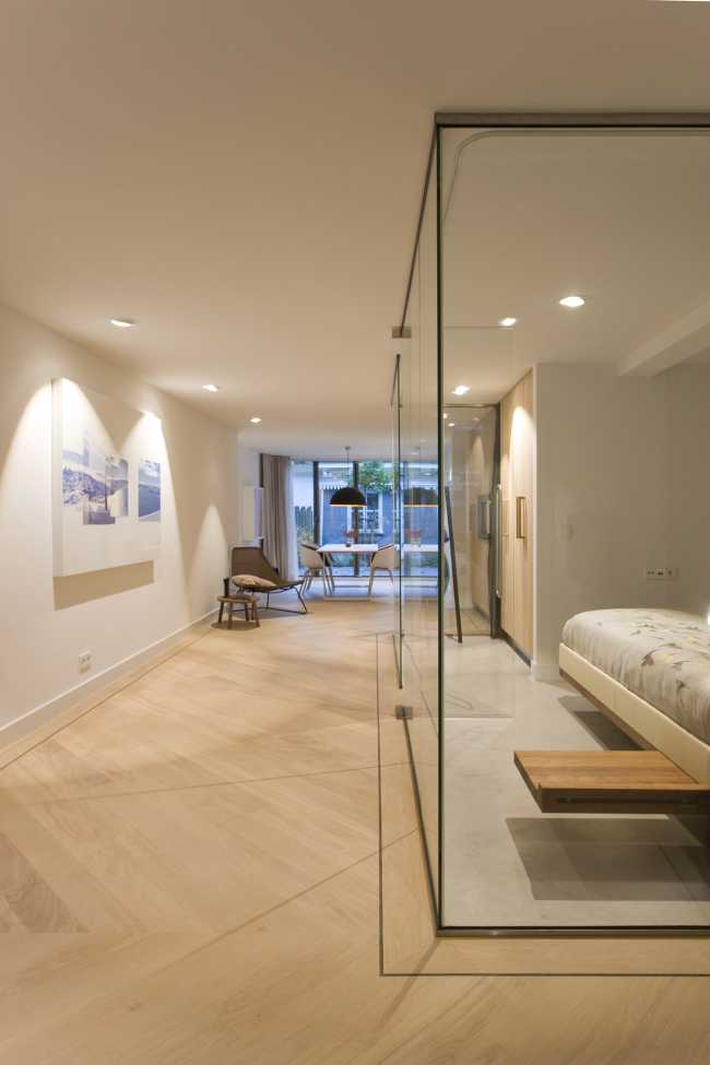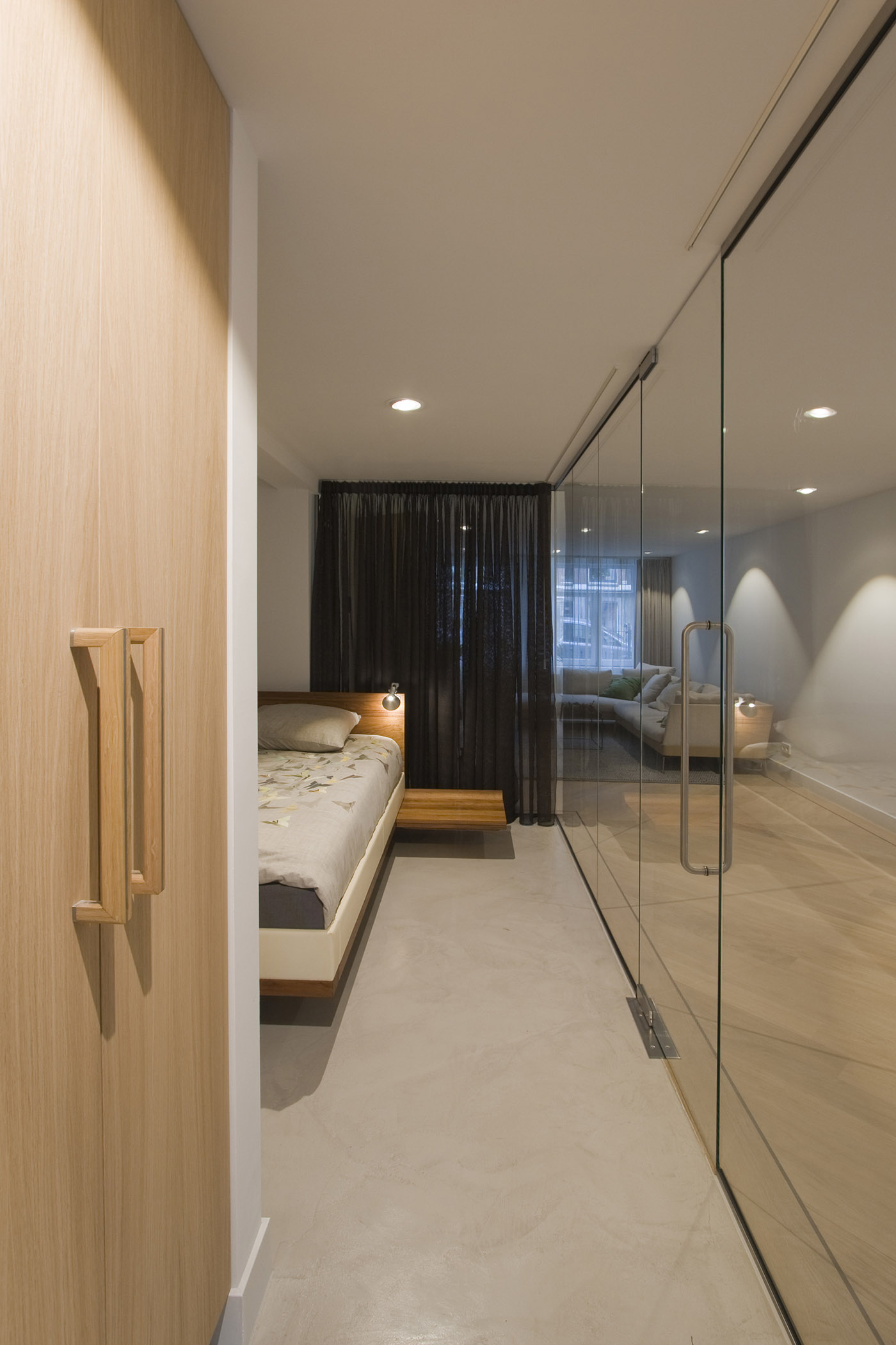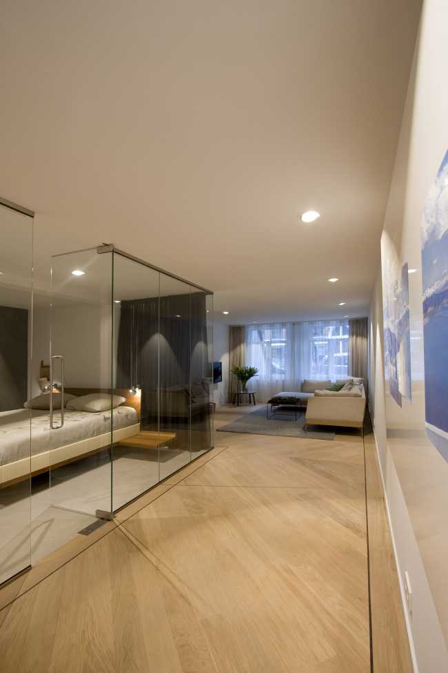 The goal was to get a minimum of natural light into the bedroom. The glass walls used to enclose the room allow the intent to be fulfilled and in addition allow the breadth of the apartment to be perceived in its entirety, creating a more spacious feeling