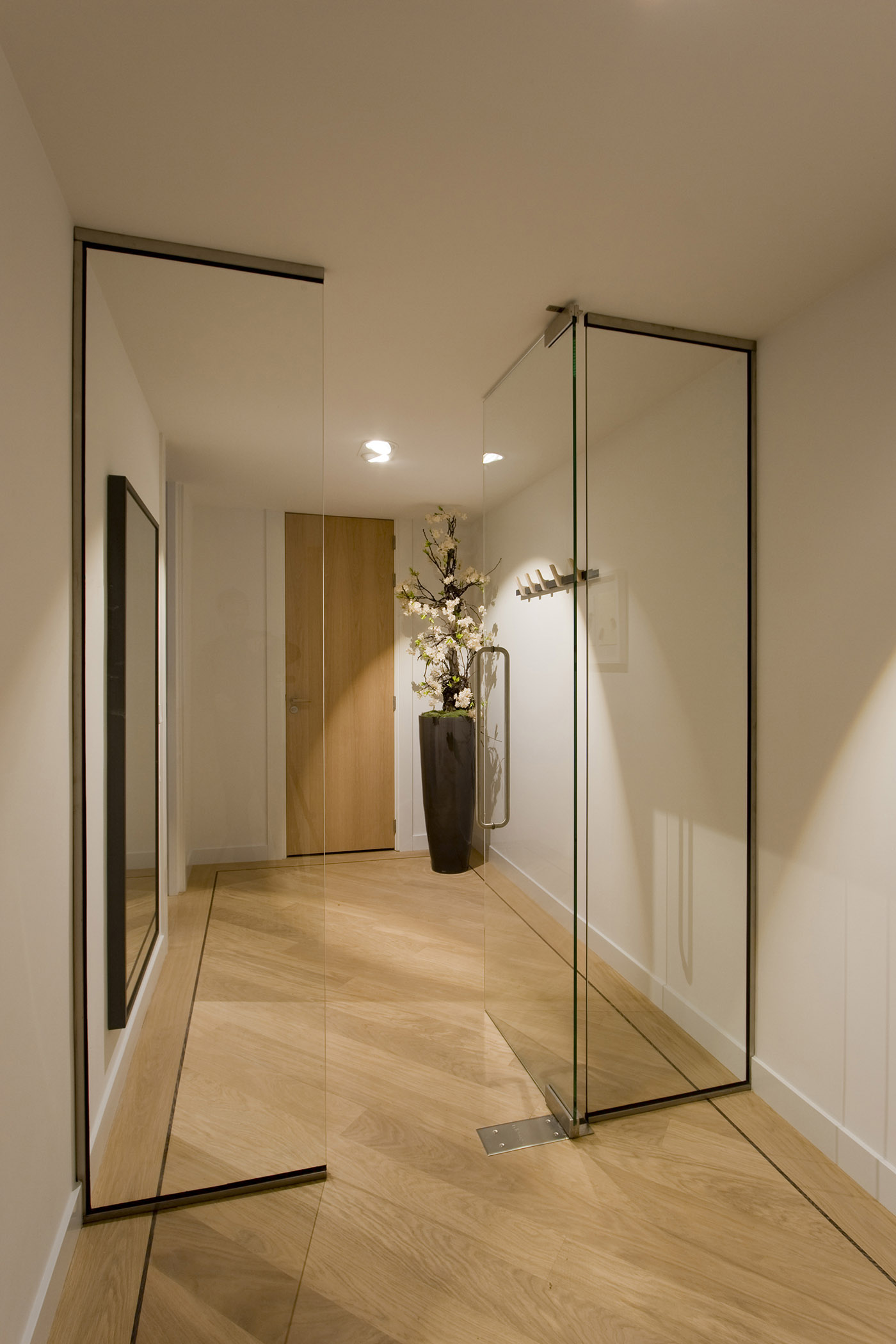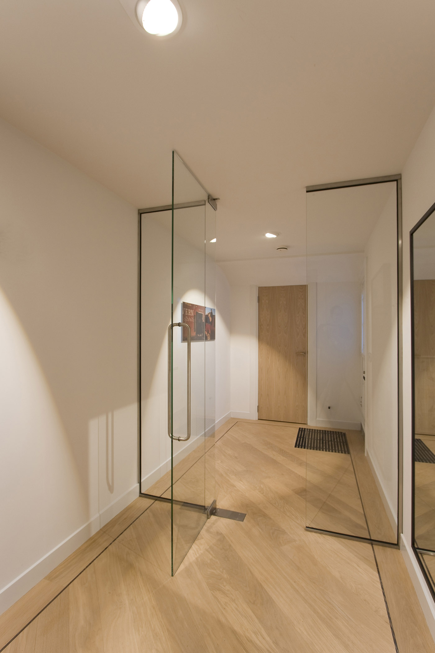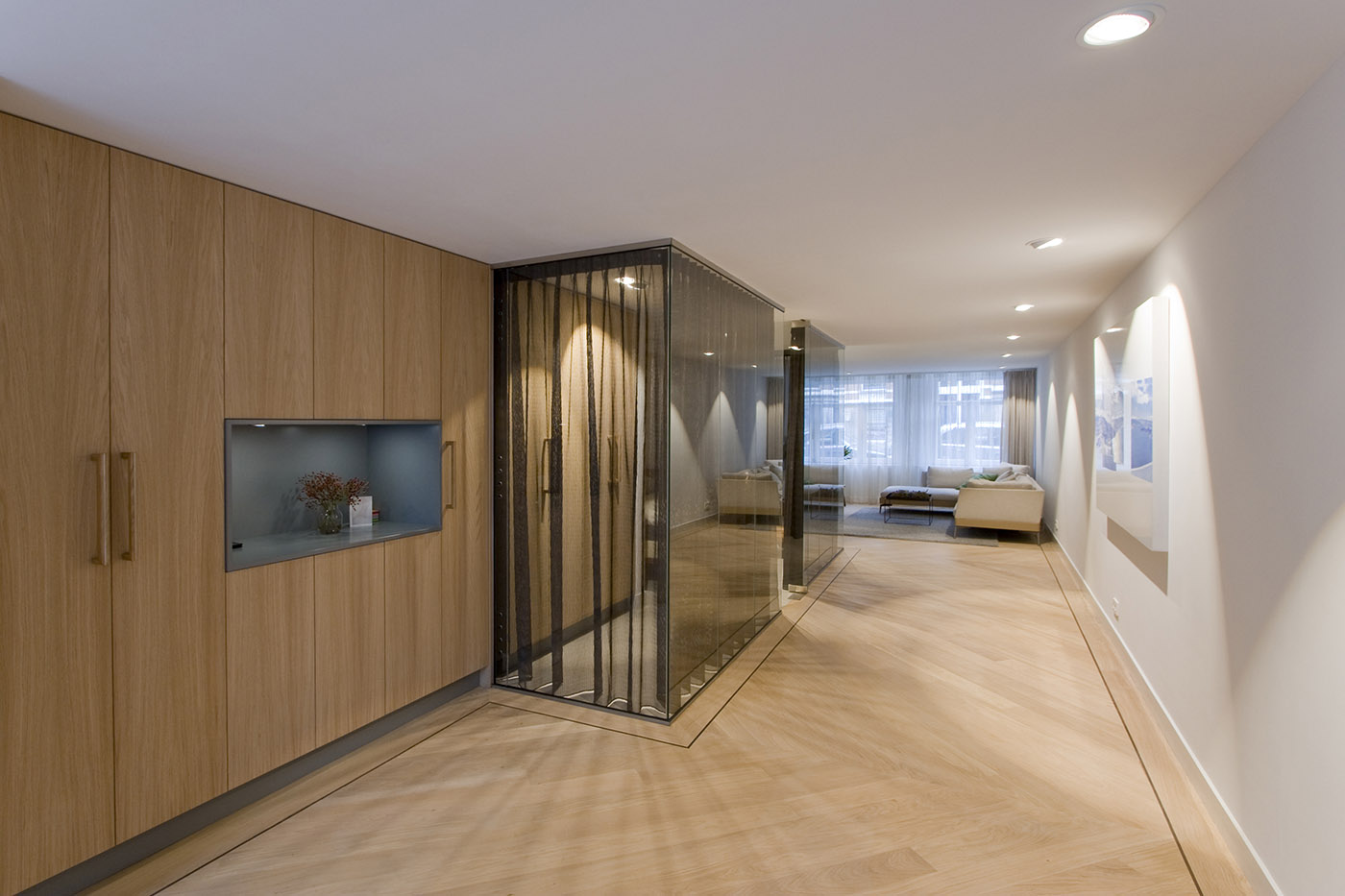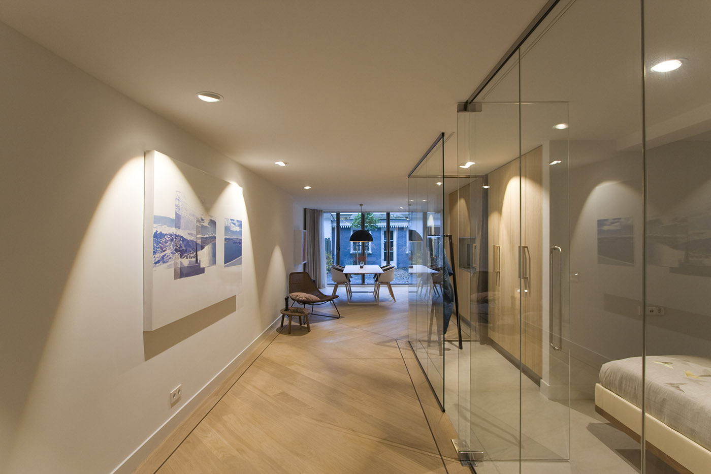 The goal was to get a minimum of natural light into the bedroom. The glass walls used to enclose the room allow the intent to be fulfilled and in addition allow the breadth of the apartment to be perceived in its entirety, creating a more spacious feeling