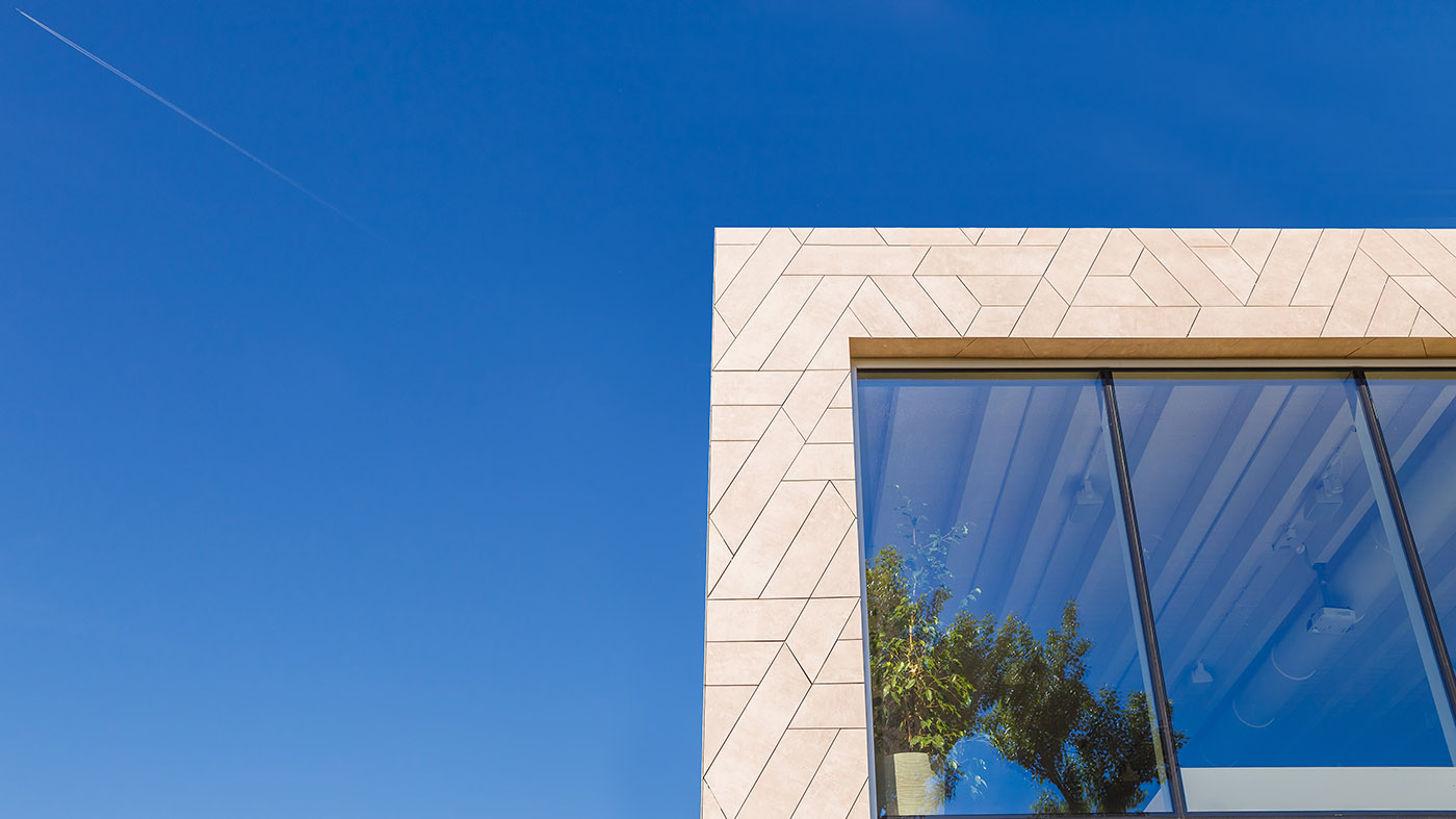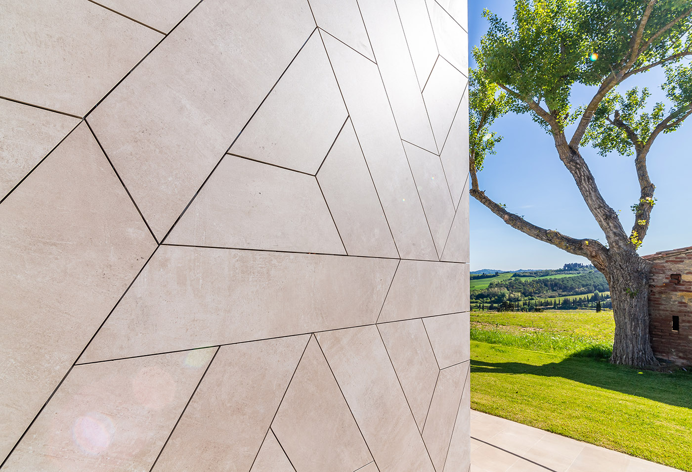 Particular attention was paid to the choice of material for the ventilated wall of the extension. The cladding, in custom-sized stoneware slabs created to a special design by Heliopolis 21, characterises the volume with a laying pattern designed to conceal the direction of cuts and joints. The design of the ashlar pattern and the assembly of the slabswastailored to the building and created by Porcelaingres on the basis of Urban Great in the colour Sand using hydrojet cutting (thickness 6mm).
