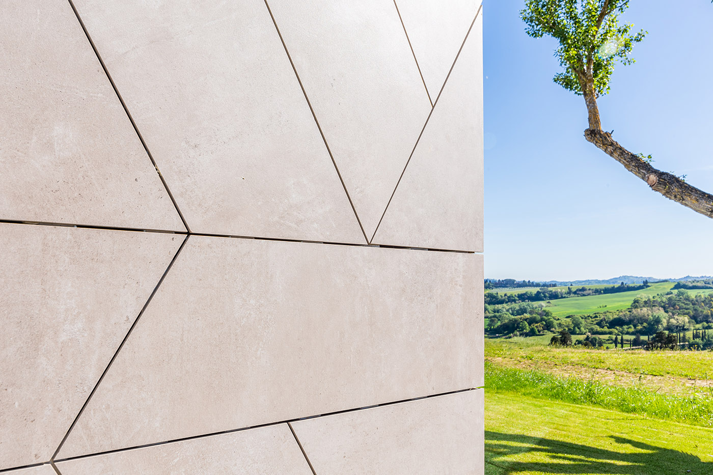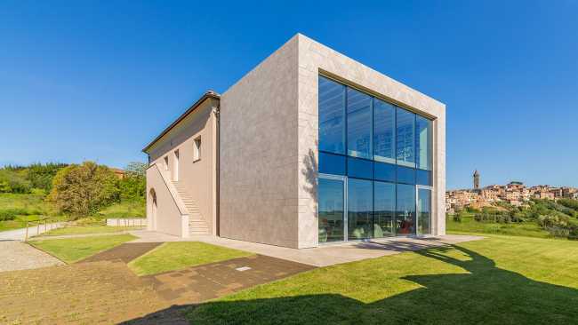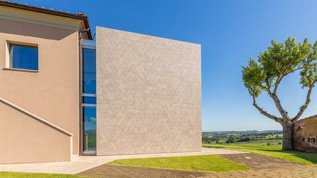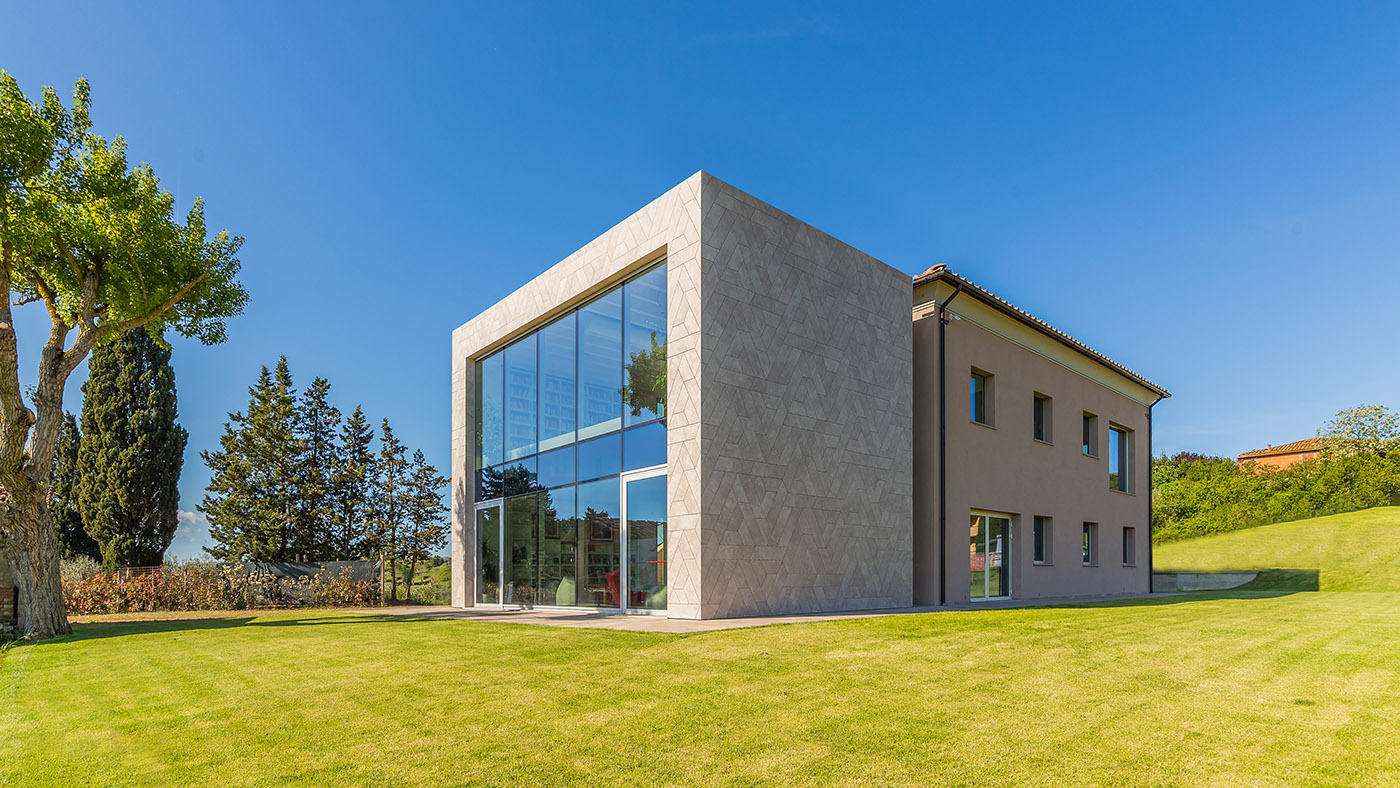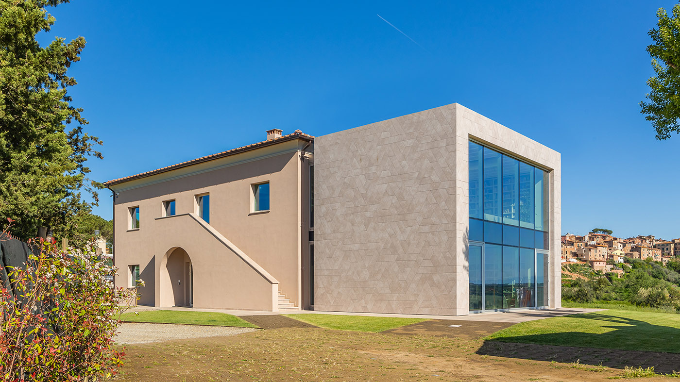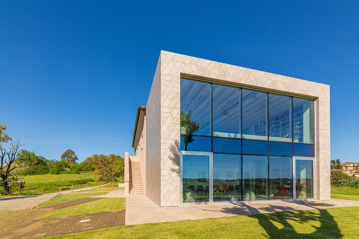 Surrounded by greenery, the library of Peccioli consists of two volumes. , the historical part restored and the new contemporary volume. The ventilated facade is covered with Porcelaingres porcelain stoneware, custom-made following the project of Heliopolis 21 Architects Associates of Pisa.