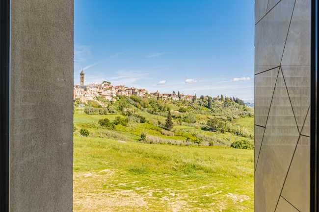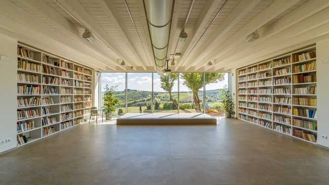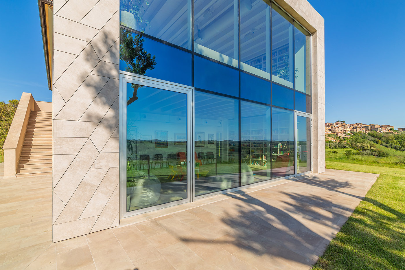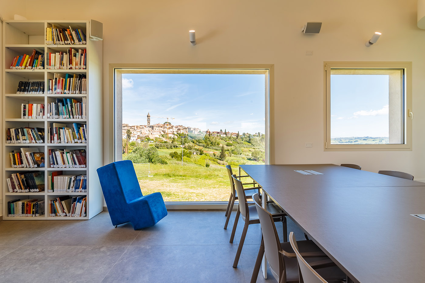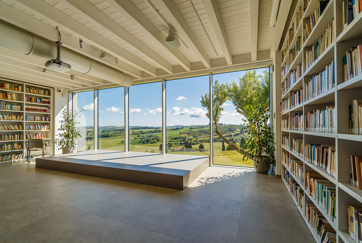 Surrounded by greenery, the library of Peccioli consists of two volumes. , the historical part restored and the new contemporary volume. The ventilated facade is covered with Porcelaingres porcelain stoneware, custom-made following the project of Heliopolis 21 Architects Associates of Pisa.