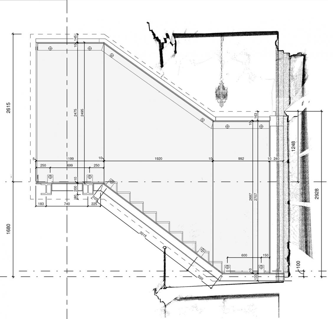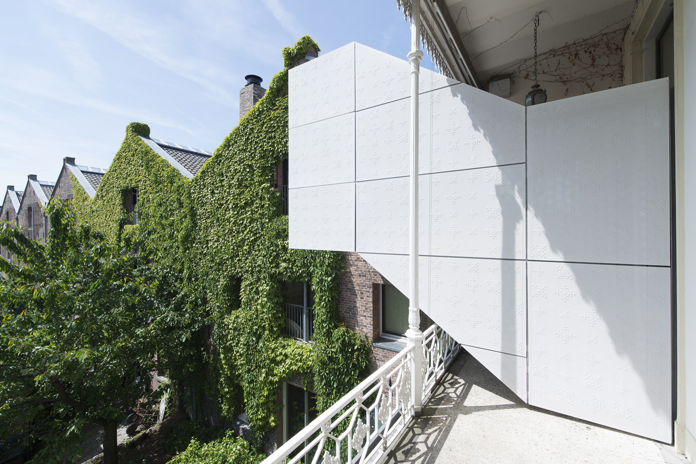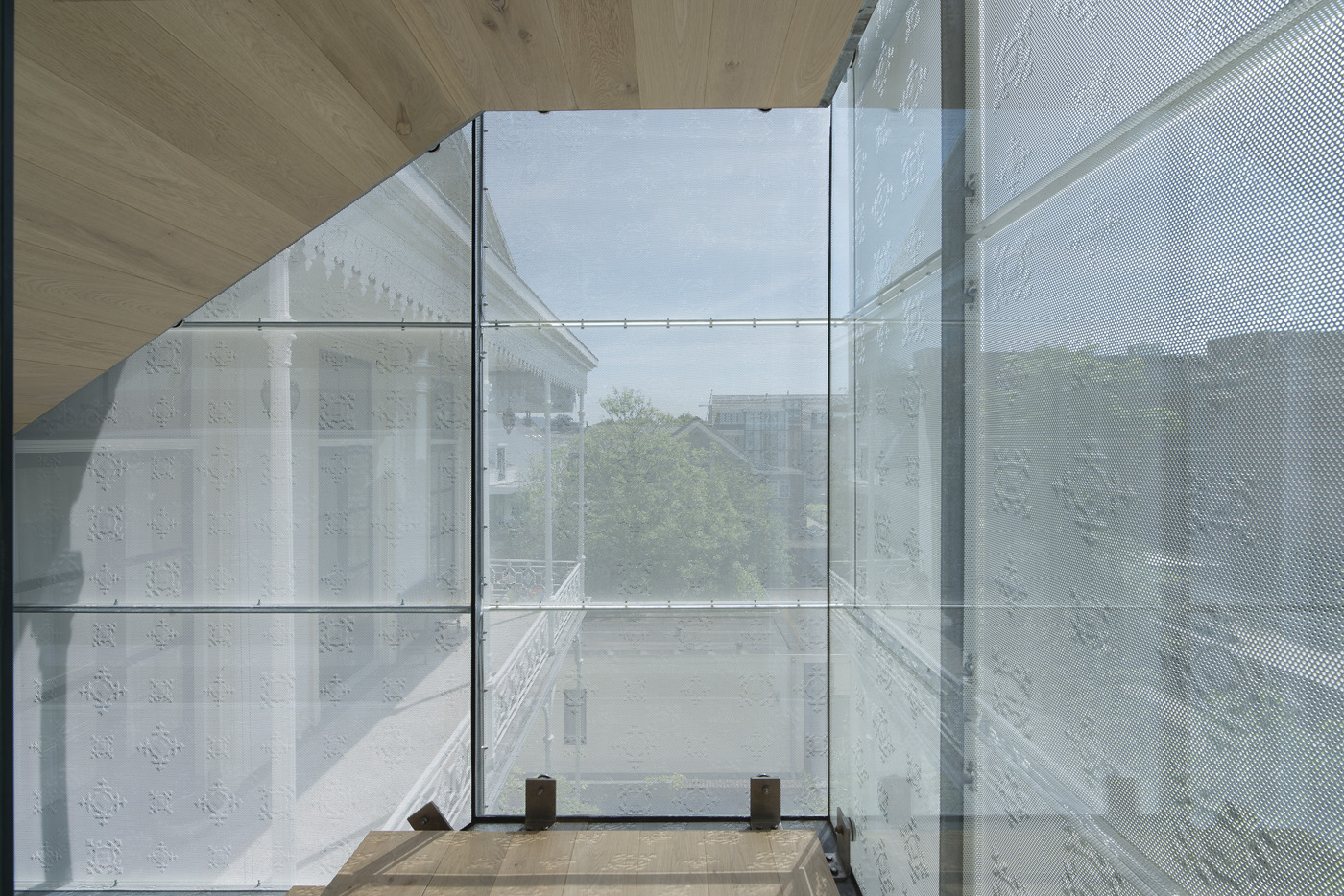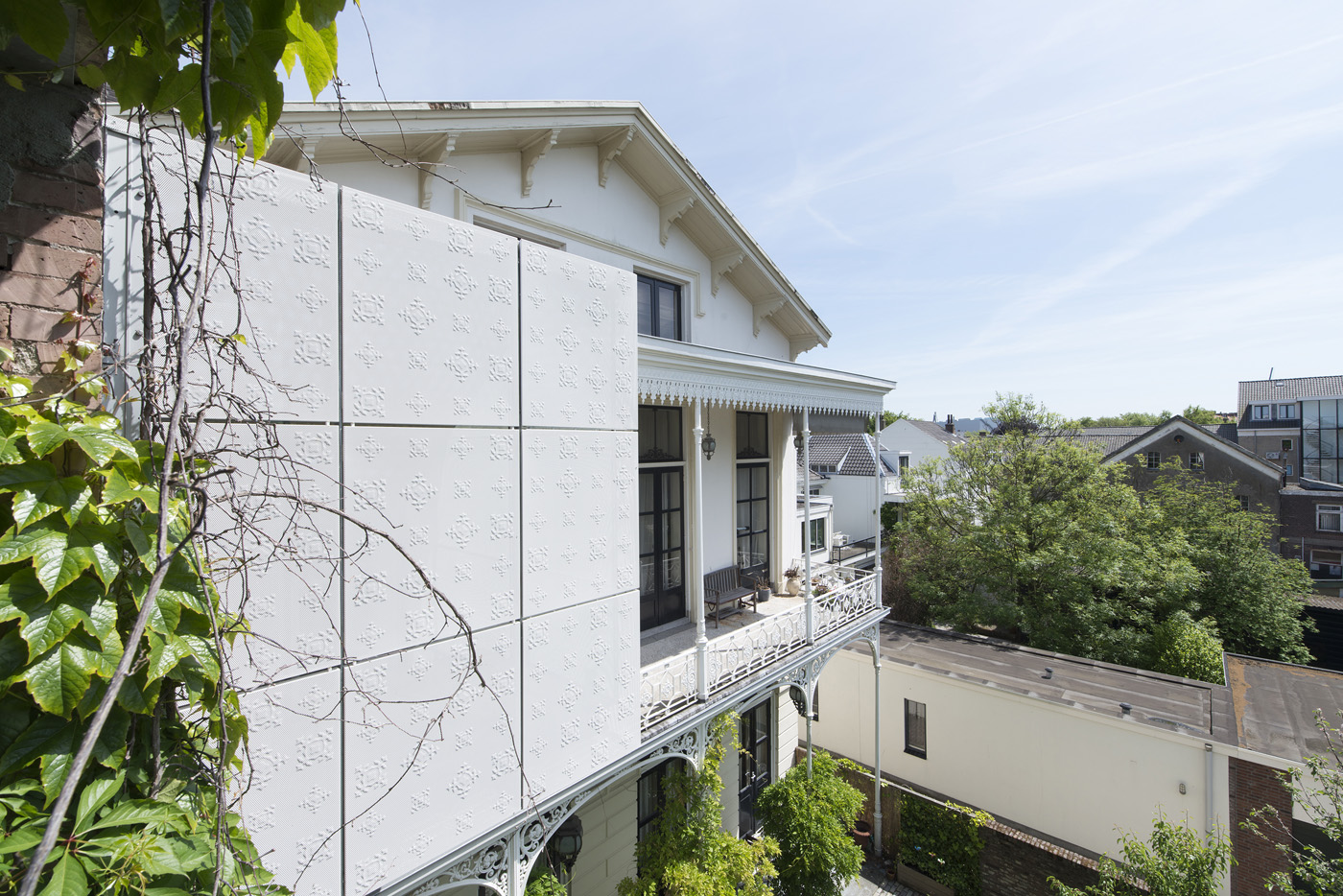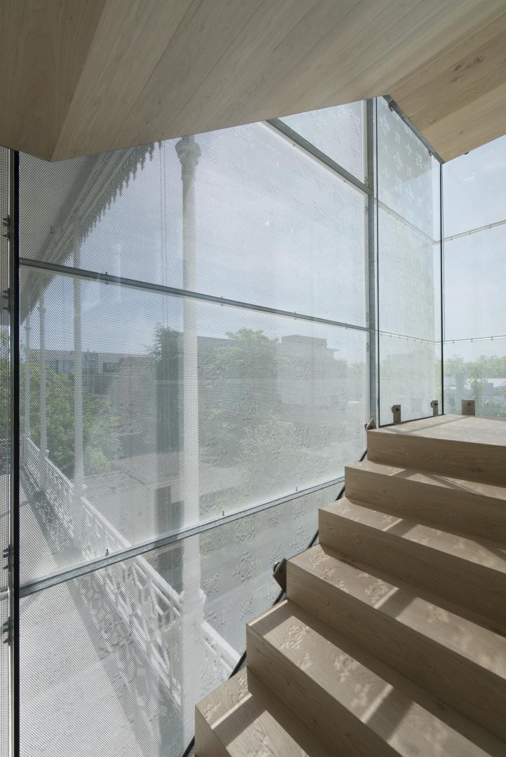 The solution adopted did not involve repeating a new glass connection but proposed a white 'cloud'. The new bridge, a self-supporting steel and glass structure, is located in front of the white perforated steel panels. The abstract 3D motifs, which are a reference to the original cast iron ornaments on the building's balconies are refined and incorporated into the panels by means of rubber presses