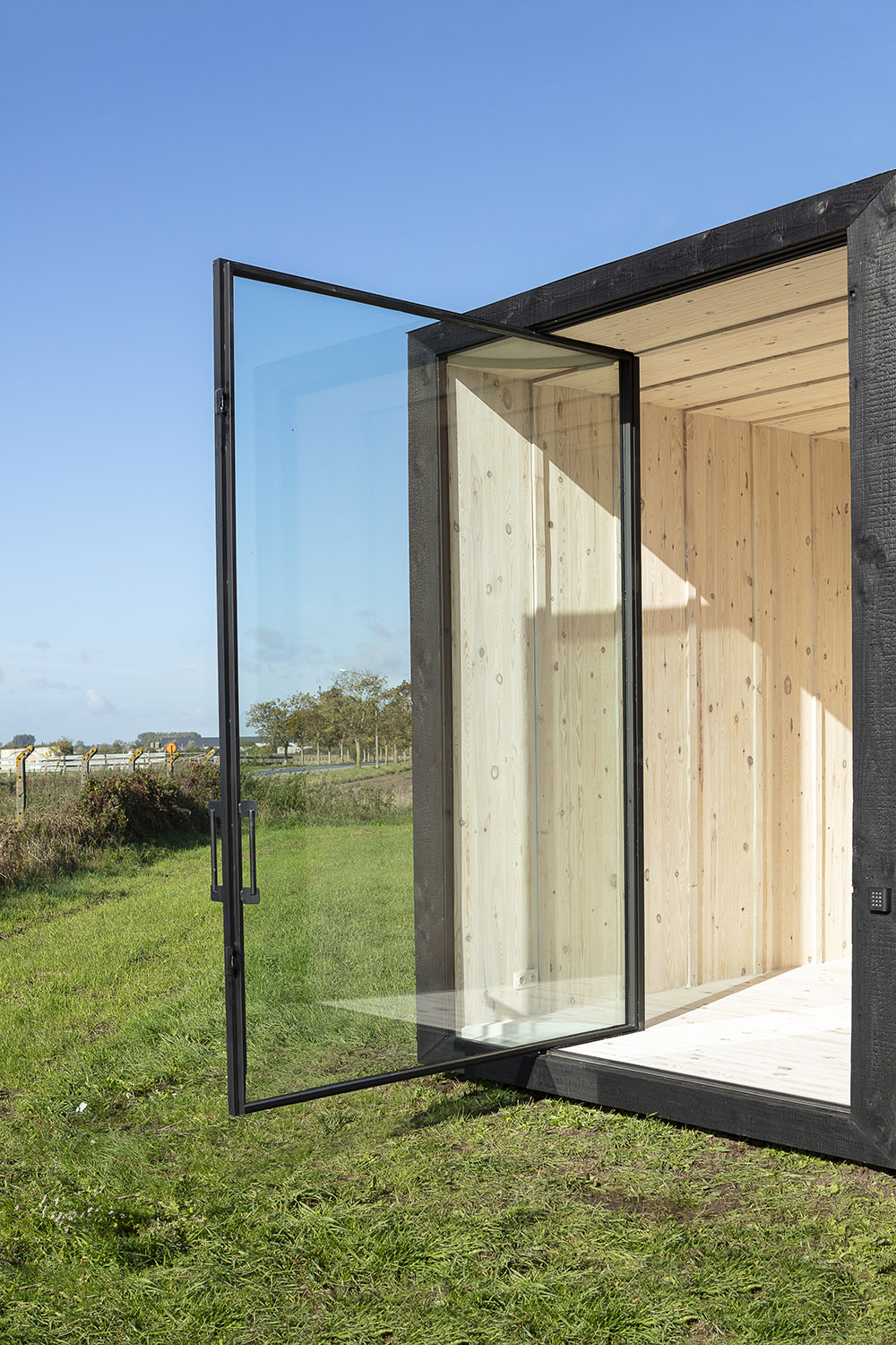The cabin is equipped with a toilet, shower and duplex beds. Thanks to photovoltaic solar panels on the roof, the living unit is supplied with continuous renewable energy. The front façade is completely made of glass, with a hinged steel frame