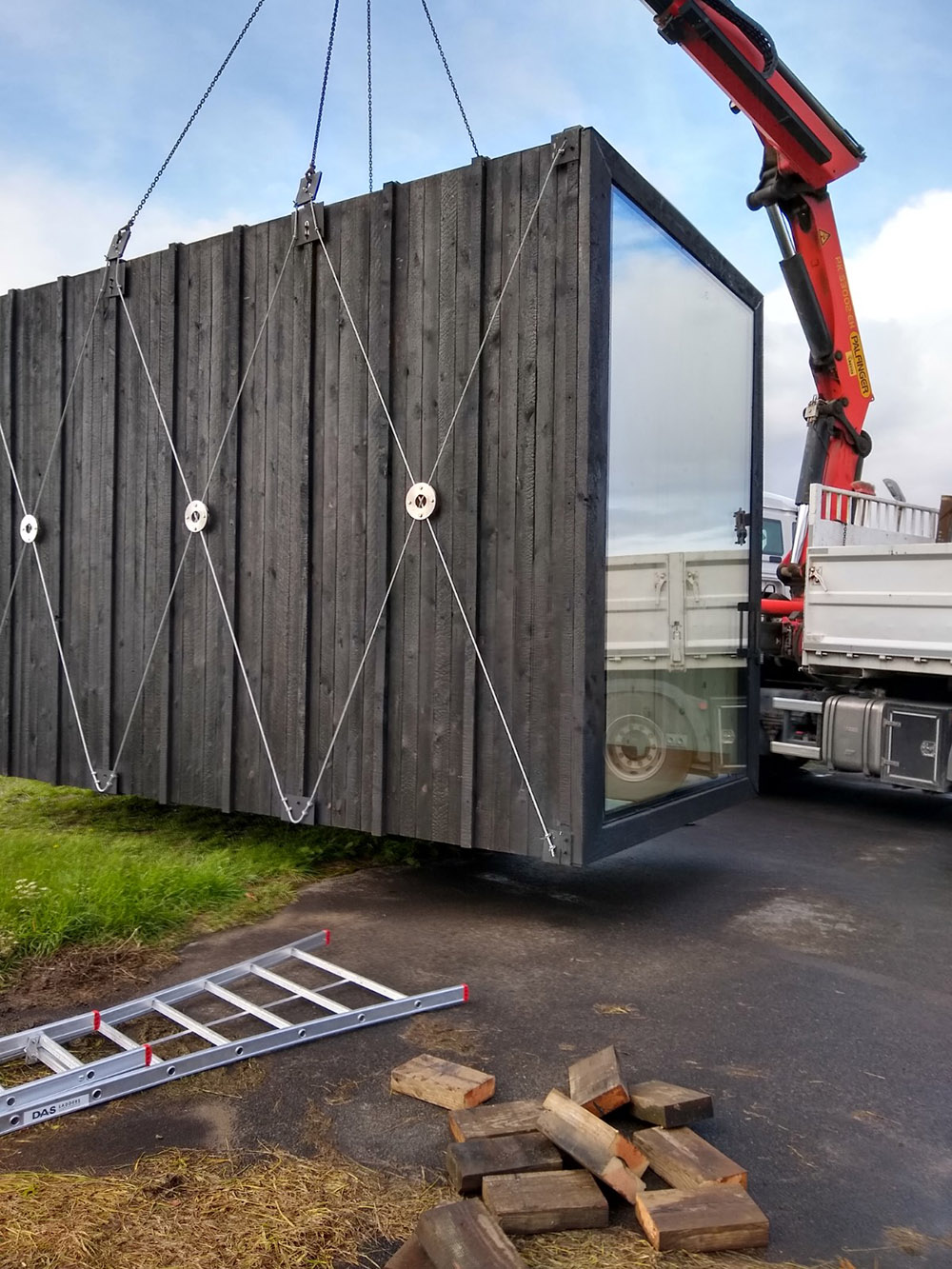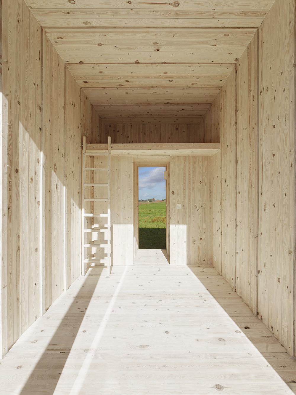 There is a hemp fiber thermal insulation between the sandwich panels. The exterior cladding is made of burnt larch wood, burning wood is a natural way to make wood sustainable without the use of chemicals, while the interior is made of white oiled pine