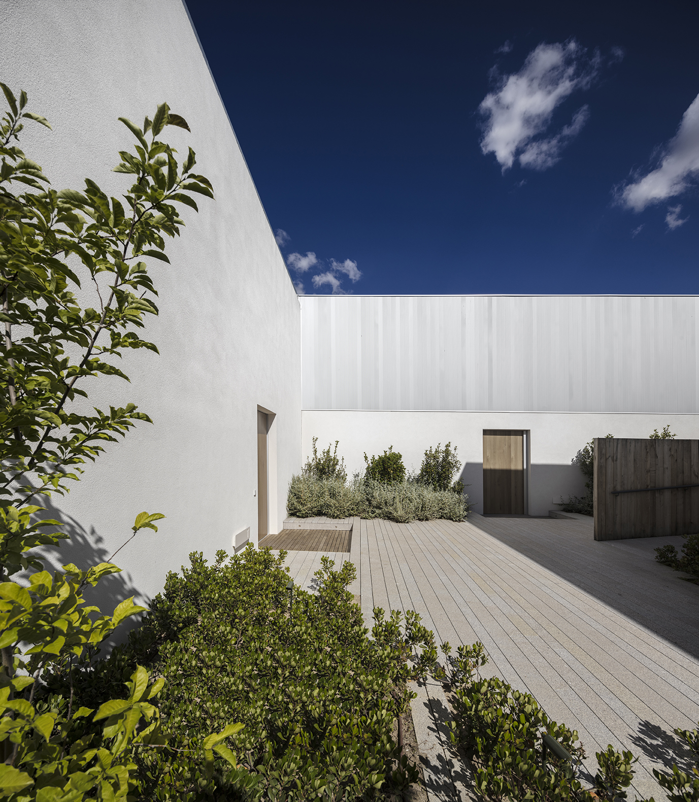 The ground floors are transparent, adapting to the public functions of life and the fully glazed walls open into courtyards that reflect the interior spaces so that the large area appears seamlessly. In the smaller houses, an elongated room houses the functions of the kitchen, dining room and living room with the possibility of dividing it or letting it converge into each other to give an impression of infinite space.