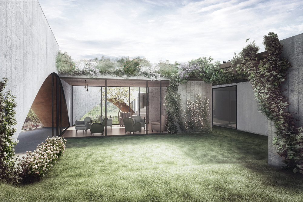 The garden is the result of two simple architectural touches: the arched wall and the underground production areas that is mostly on one floor, as both its purpose and the topography requires.The main materials are white cement, traditional local stones, finishes made of burnished brass and last but not least, a selection of local plants and grass in shades of purple, red and yellow. The hidden garden houses a selection of special roses and climbing plants.The concrete structure and the high-tech hydraulic and mechanical systems complete the unique combination of aesthetics and functionality of the building.