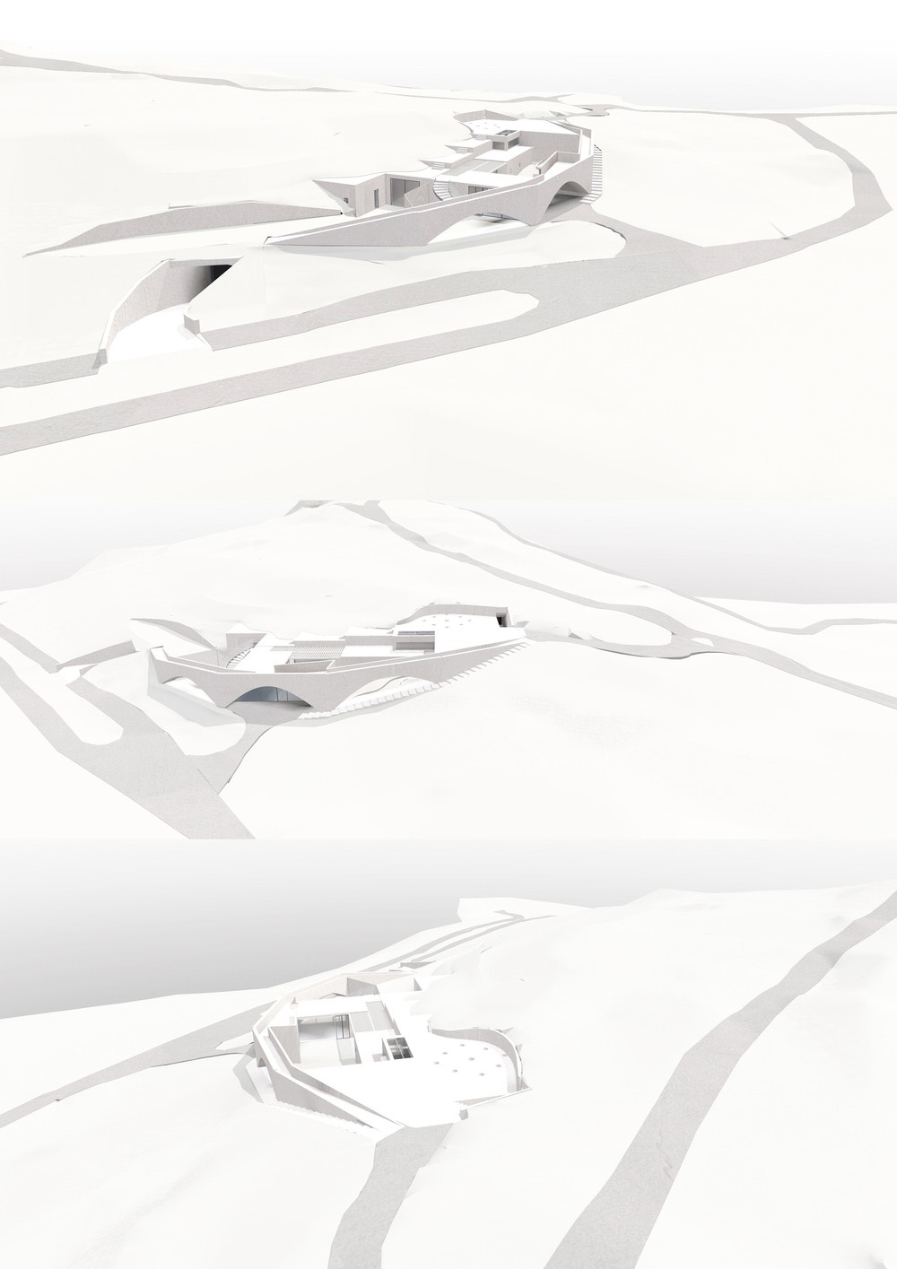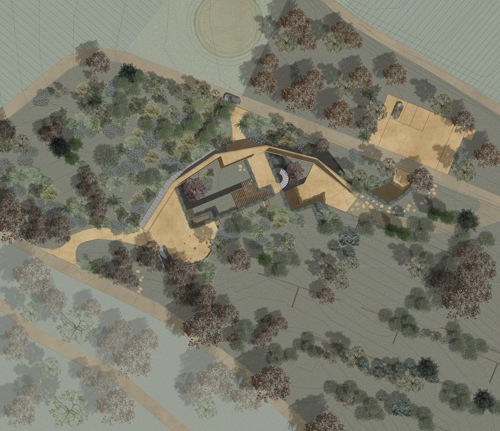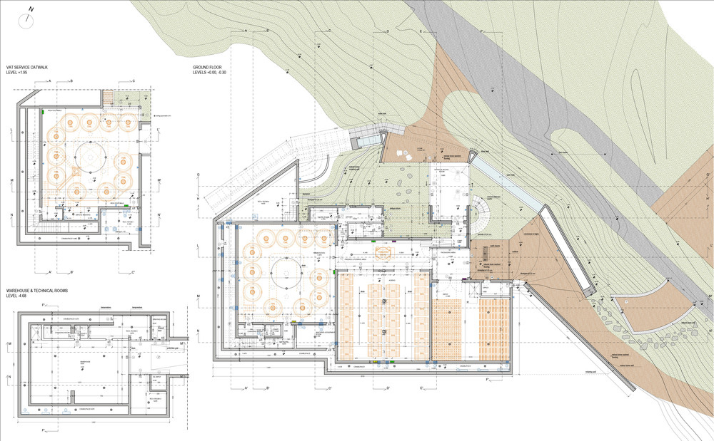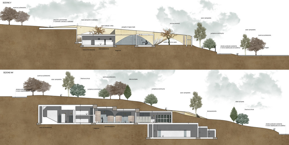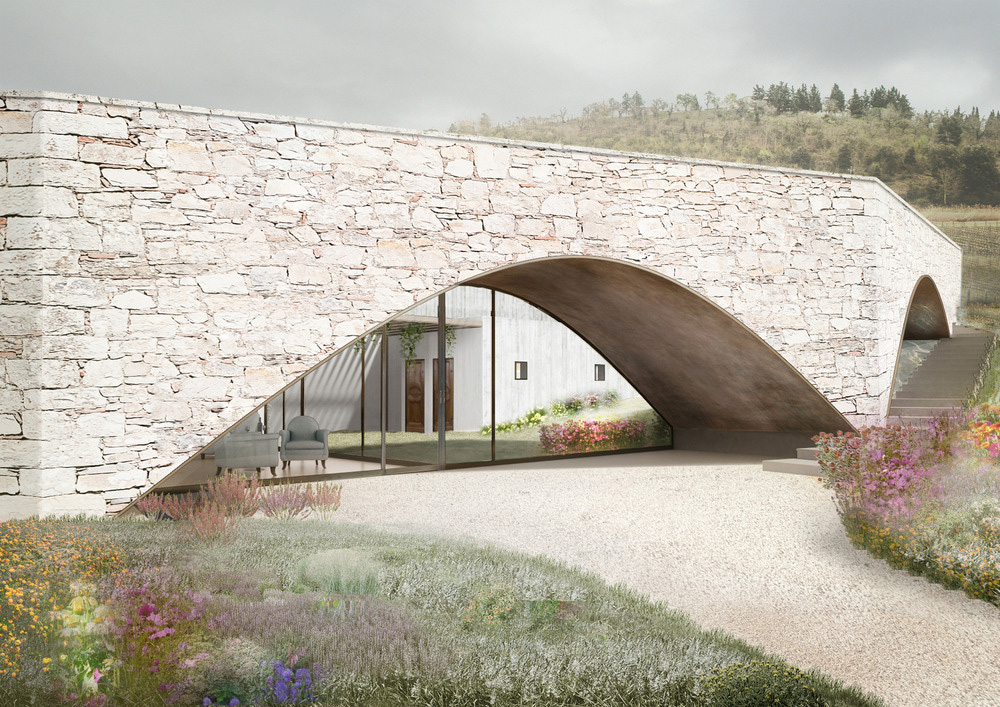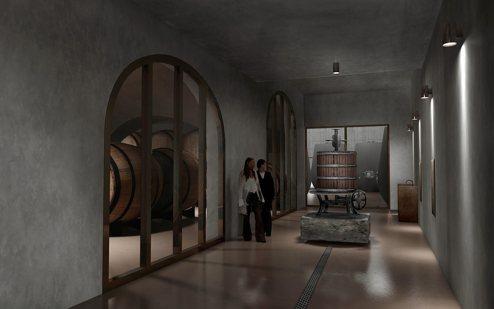 The main façade was chosen to reflect the unique topography of the site: an arched stone wall that runs along the existing ground levels, with an elevated path at the top. The wall is divided into five parts to embrace the natural development of the hill, growing from the lower level and ending within the hill on its higher level. Different walkways help visitors stroll through the surrounding landscape from different perspectives and all end up in a hidden garden that houses a glass pavilion for tasting and selling areas. The only view over the vineyards is framed by three arches. Additional external paths connect the entrances of the building with the existing agricultural paths, providing flexibility to the activity of the workers.