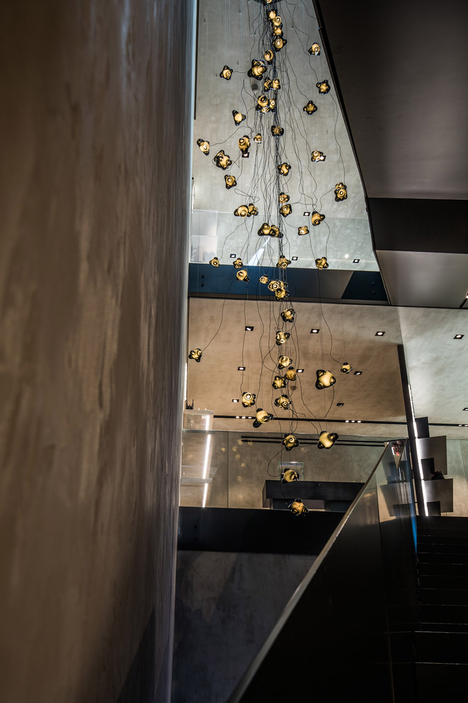 The space is dominated by the contrast between the metal of the furniture and the rough plaster of the walls or the silk velvet coverings of some of the wings and the materiality of the floor, the result of a clever mix of polished concrete and aggregates from local quarries
