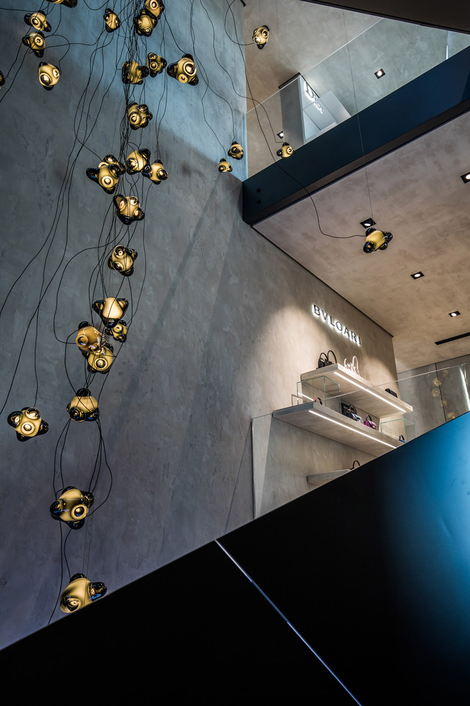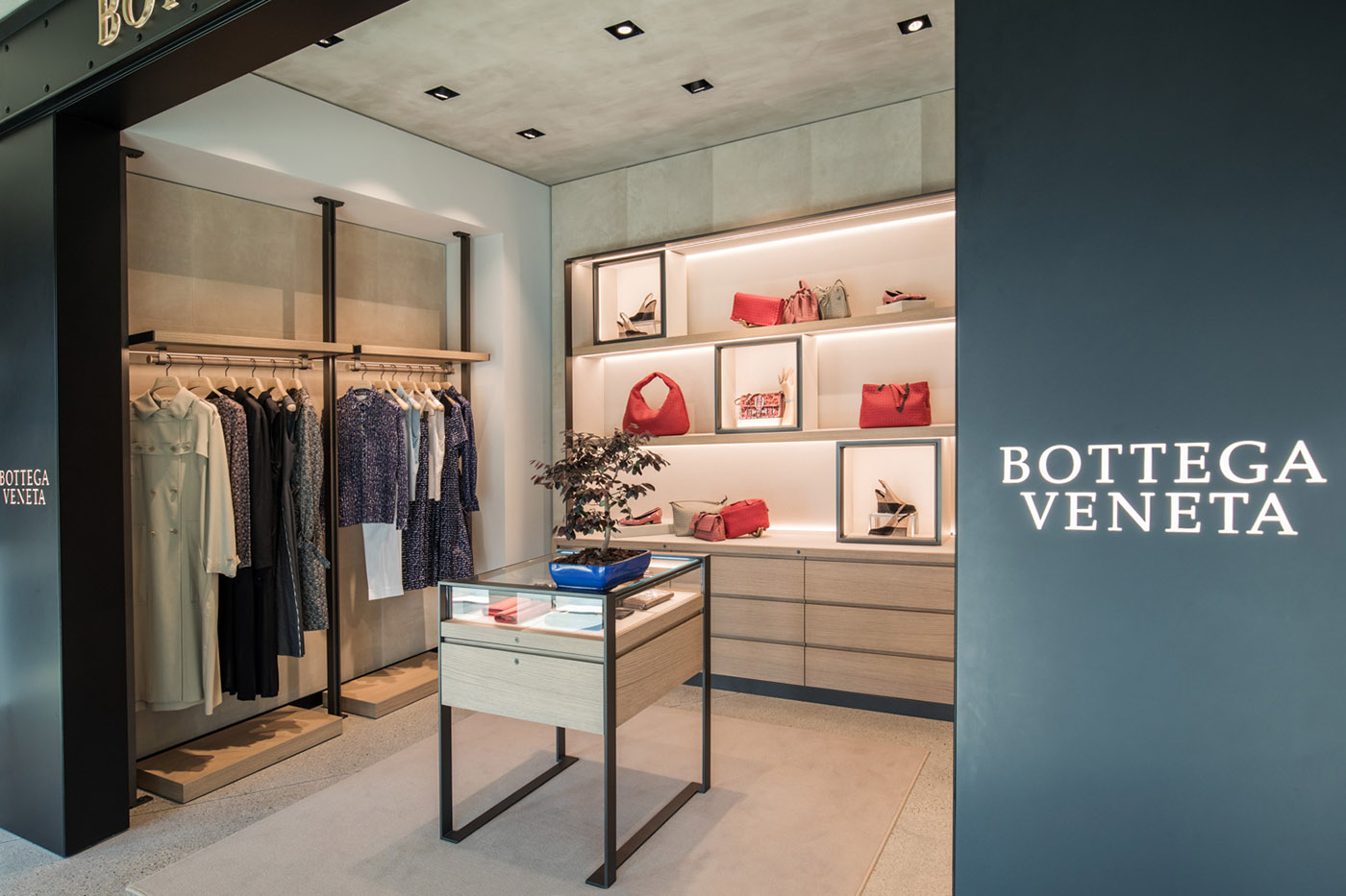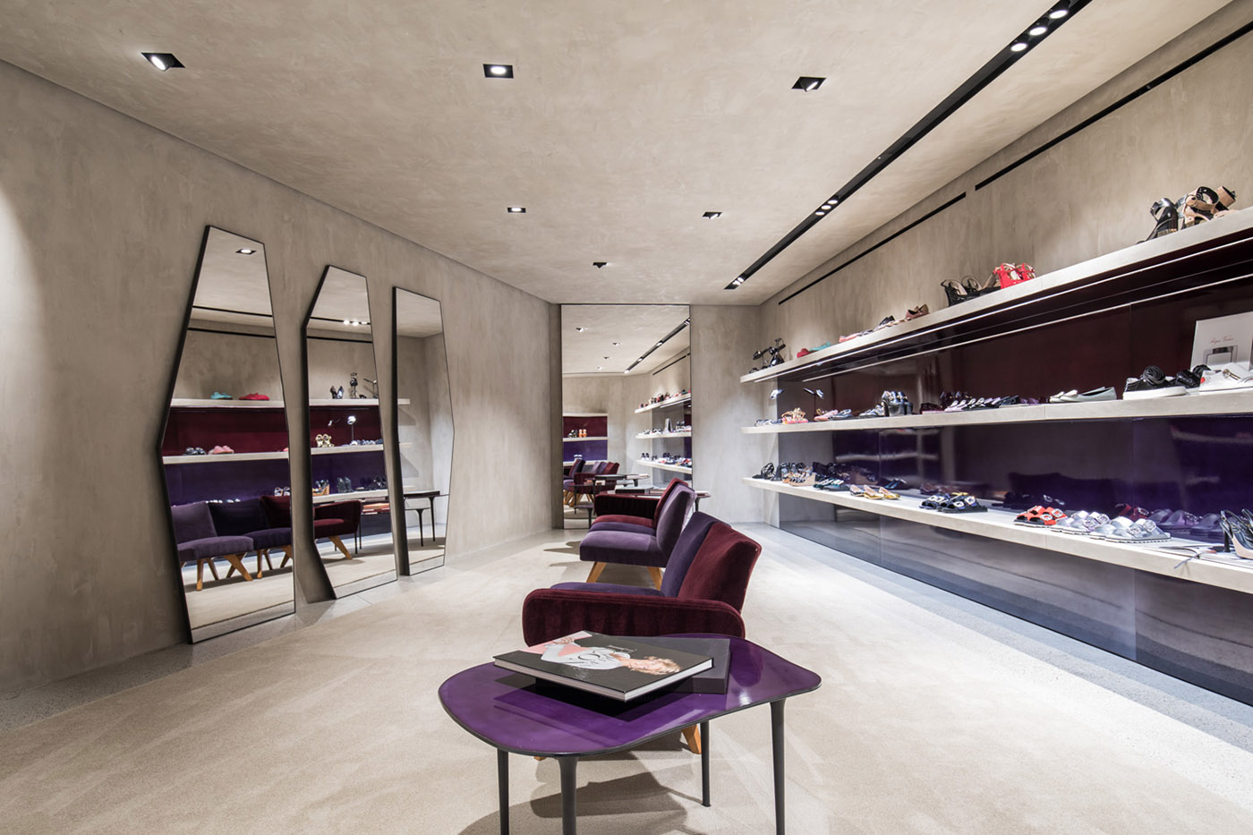 Sinuous metal sheets with a thickness of 3 mm are handcrafted to support the exhibition and emphasize the products against a neutral and dark background. The furnishings, all custom designed and function as true architectural devices at the service of the sale, in addition to articulating and hierarchizing each interior space