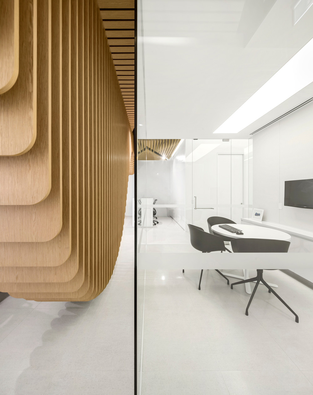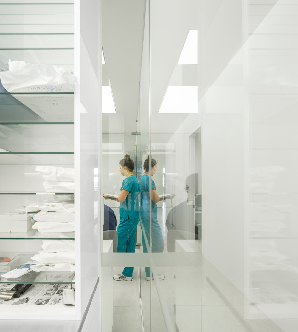 The rest of the clinic's space is organized around a central corridor that starts at the reception connecting all the clinic's spaces, from the examination areas to the doctor’s office, from the patient areas to the technical spaces. At the centre of this corridor is a transparent glass core that allows natural light to penetrate into the space.