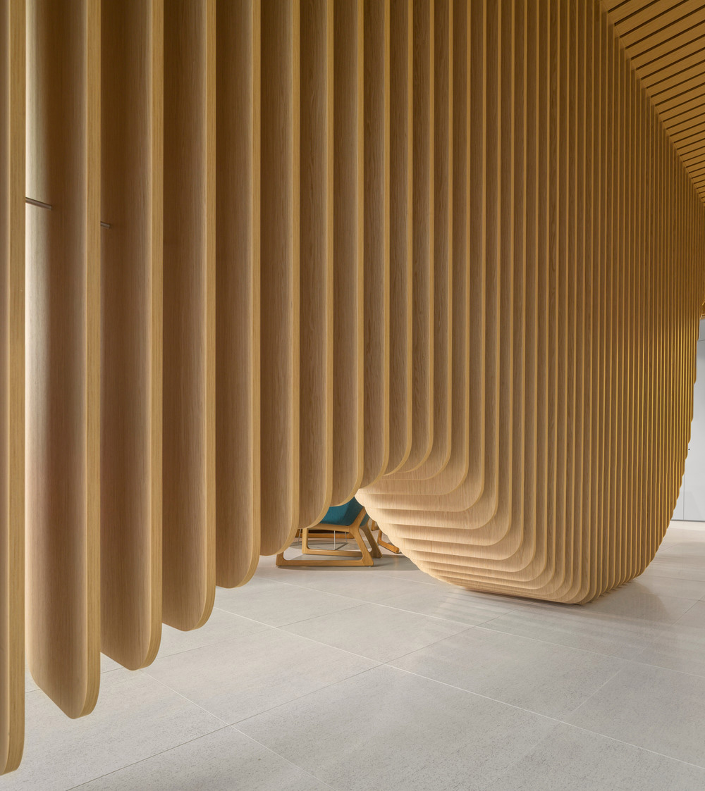 A wooden sculptural element is created to act as a filter between the two reception areas. This element has a dual function: to permit a partial view between the spaces, separating them and making the bulky concrete column disappear. Built with suspended wooden planks that initially start narrow and then widen and swallow the existing column, this element is the answer to all initial demands and functions as a space generator, influencing the ceiling and other elements.