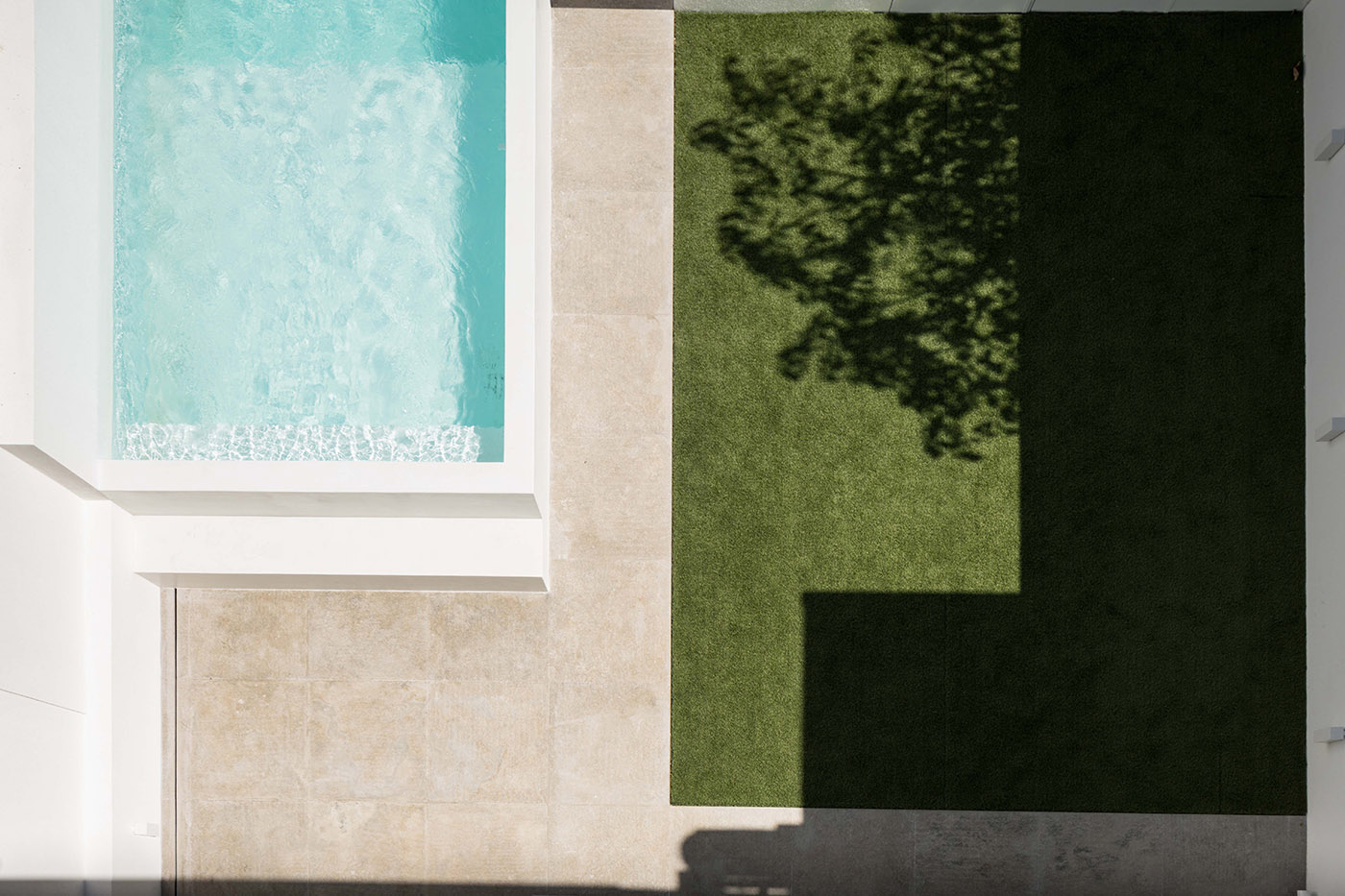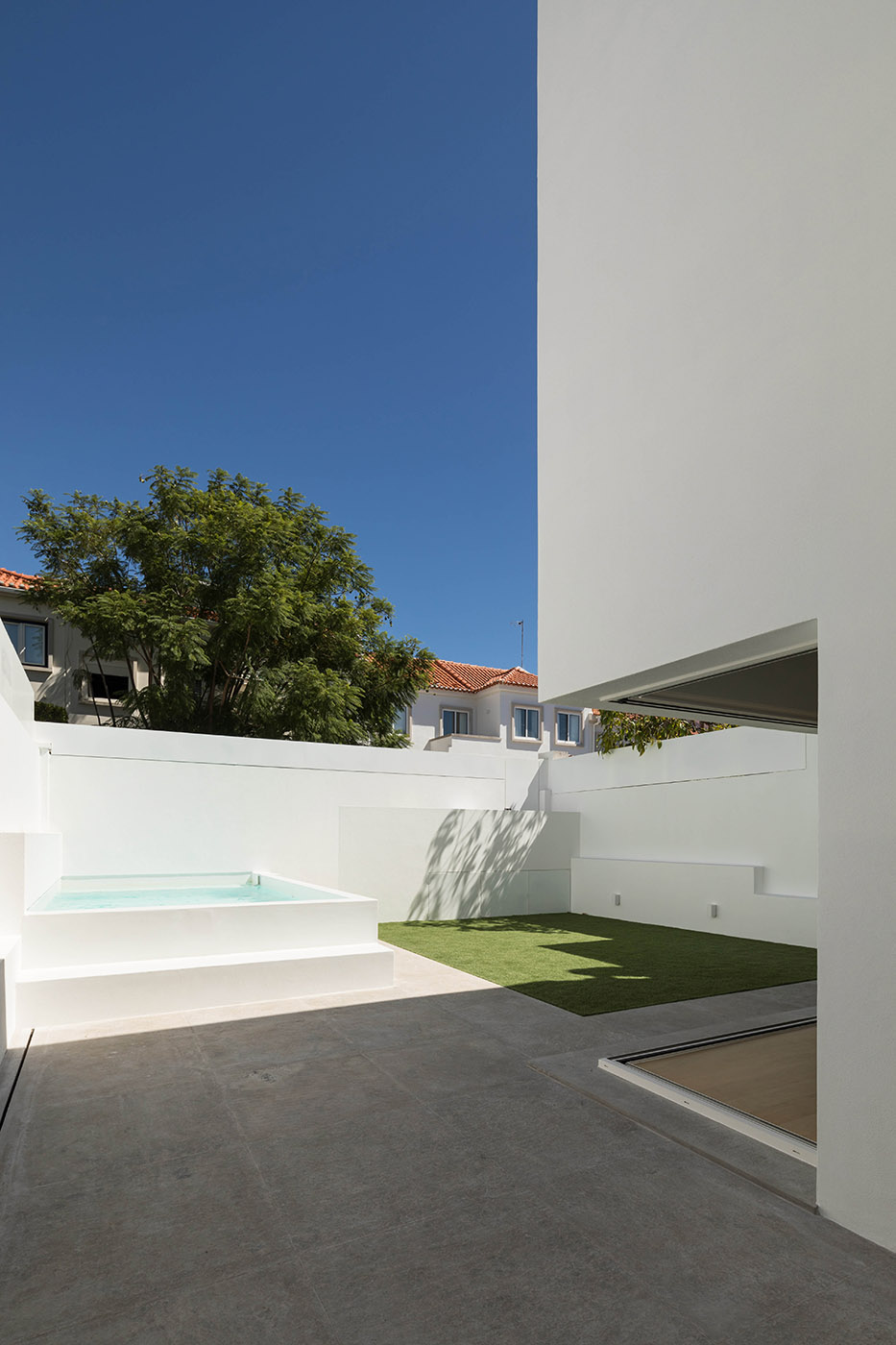 The topography of the courtyard has been redefined since it was initially on a much higher level than the house and difficult to use. In axis with the kitchen, an outdoor dining area has been designed. There is a small garden connected to the living room with a cistern for water, which makes it possible to freshen up in the summer months
