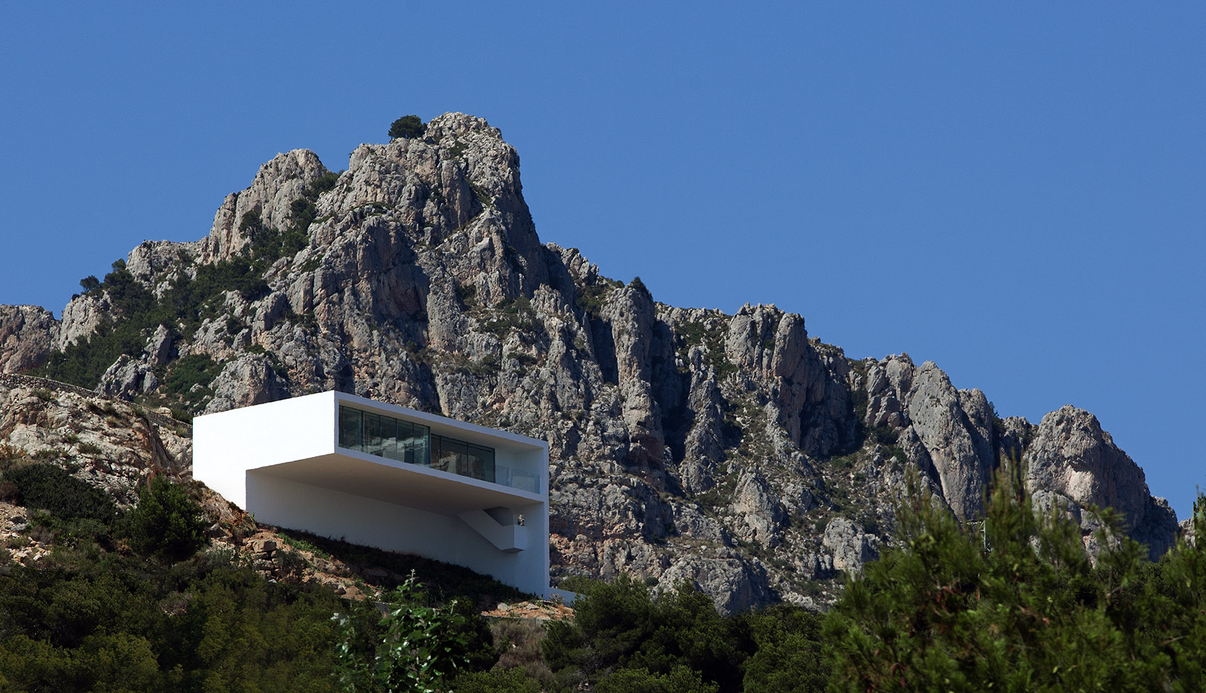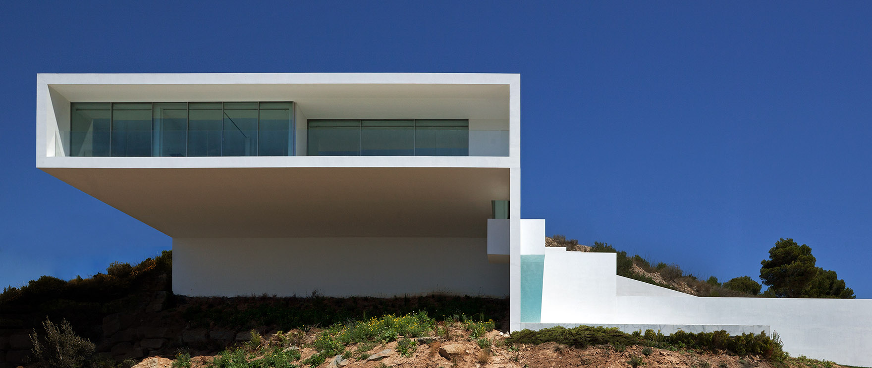 The Spanish Studio Fran Silvestre Arquitectos has designed this Villa in Alicante, sandwiched between the mountains and the sea, reflecting blue with its glass and its swimming pools, to enhance the quality of the architecture, capable of making it possible to build in the air.