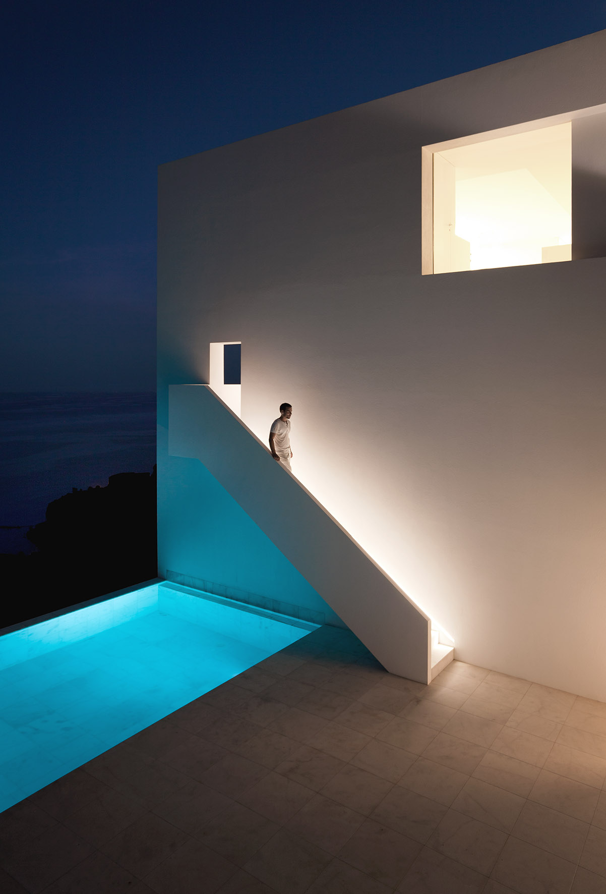 Its monolithic form and strong geometries seem to be in contrast with the territory, but this architecture manages to give serenity because of its complete white, its blue reflection and the desire for a holiday that it arouses.