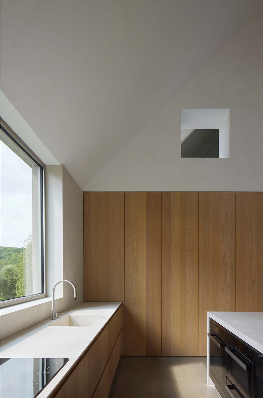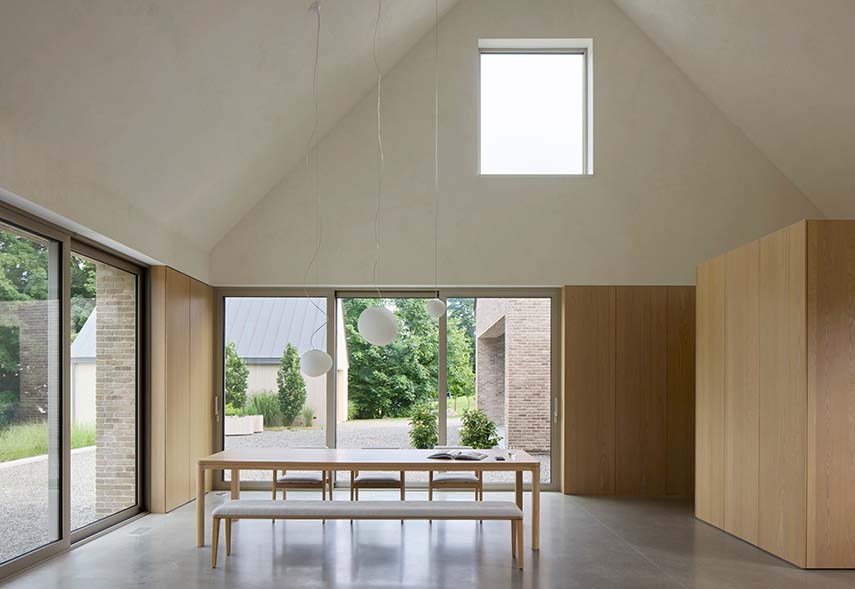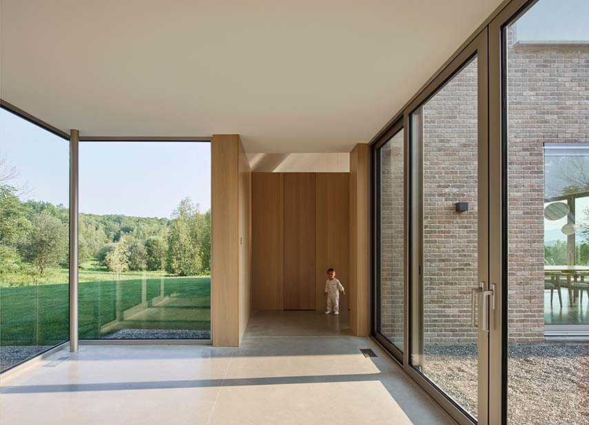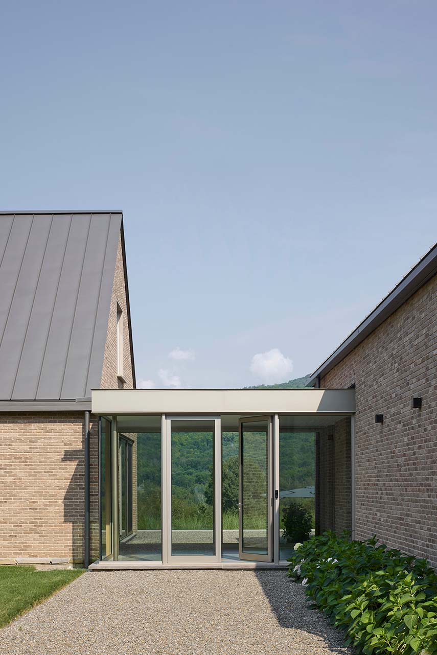 Comprising three cabin-like volumes, the house evokes ancient agricultural settlements: two main buildings, the residence and the garage with guest accommodation, constructed in brick and stone, and a smaller third volume, a cedar-clad stable.