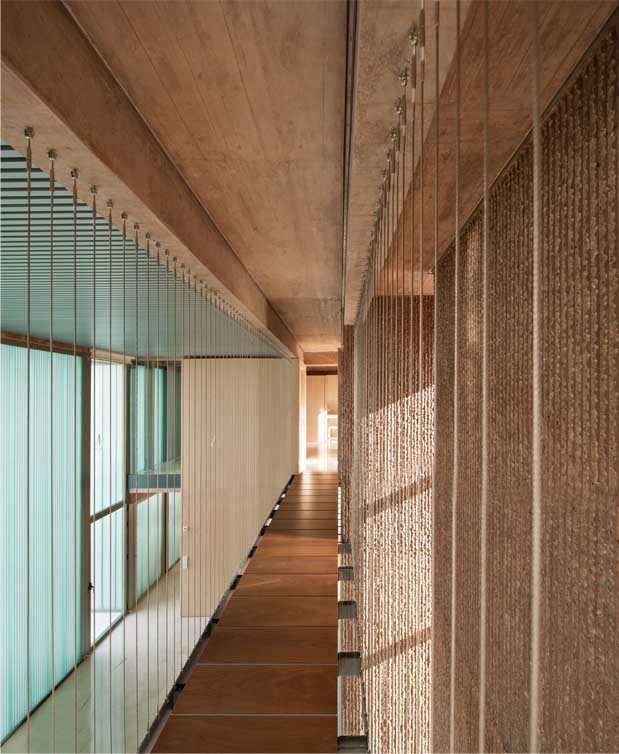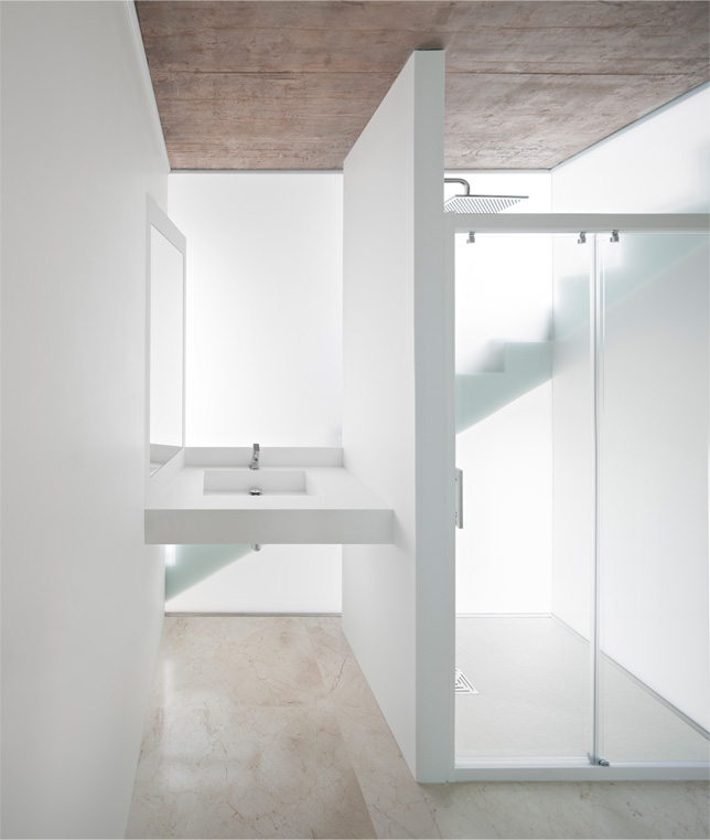 300 km from Madrid, in Ciudad Real, the specific urban planning constraints limit the dimensions of Casa Fuensanta, which results in two volumes attached to the borders of the lot, and conceived as blind boxes in reinforced concrete with a transparent central volume