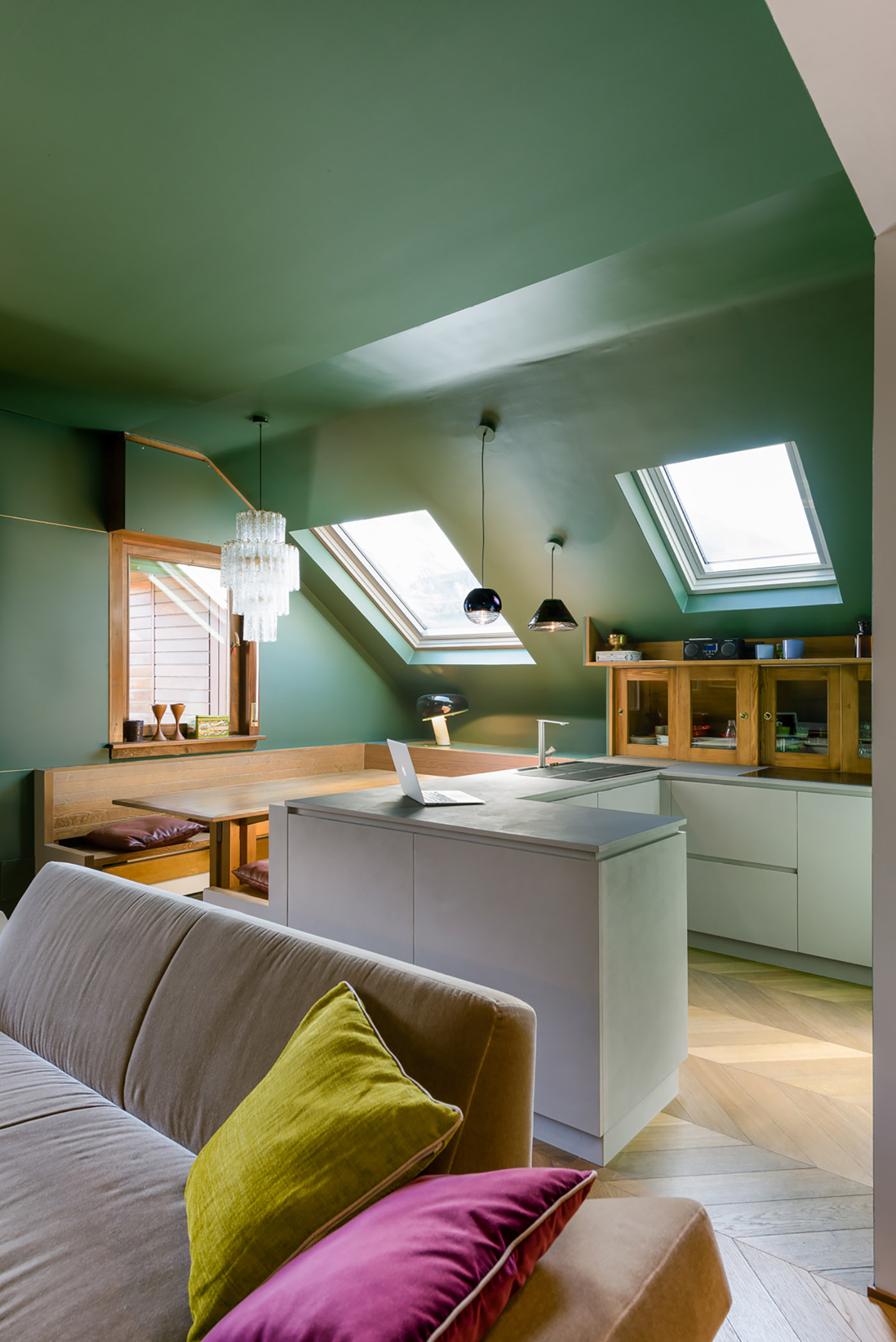 From the project comes a new living room with an open kitchen in cement resin with a warm color that becomes a contemporary sign. The original wall units were recovered through restoration work. Instead, the existing paneling is replaced with a new one, lacquered in dull green and with brass inserts that soften it, giving strokes of light to the room and creating a nonrepetitive design