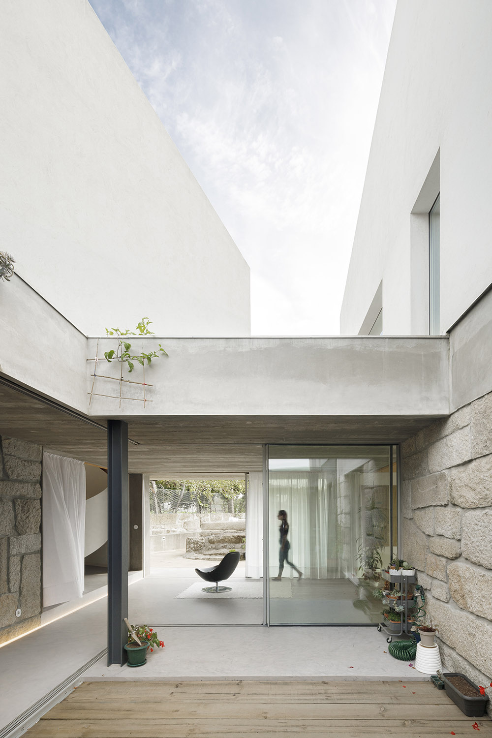 The creation of the roof garden on the central slab offers a new intimate garden to all the rooms of the house on the second floor. On the ground floor, a more rugged materiality conveys the feeling of living in a heap of excavated granite in a strong relationship with the outside space