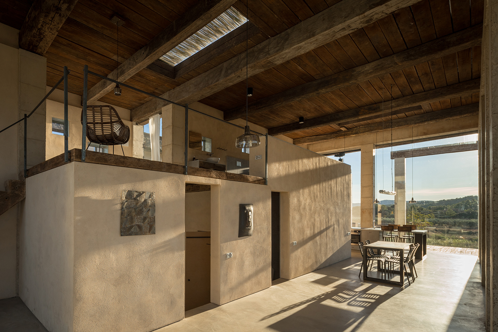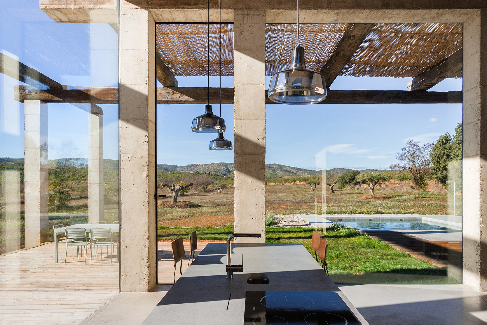 As a matter of fact, the Villa is located in the hinterland of Castellón, in a purely mountainous area, and the house stands on a flat and uniform area, making the vertical arrangement of the outer plot even more visible. The concrete pillars, the wooden beams from the pylons of the port of Rotterdam and the iron and glass elements show their true essence without concealing their character