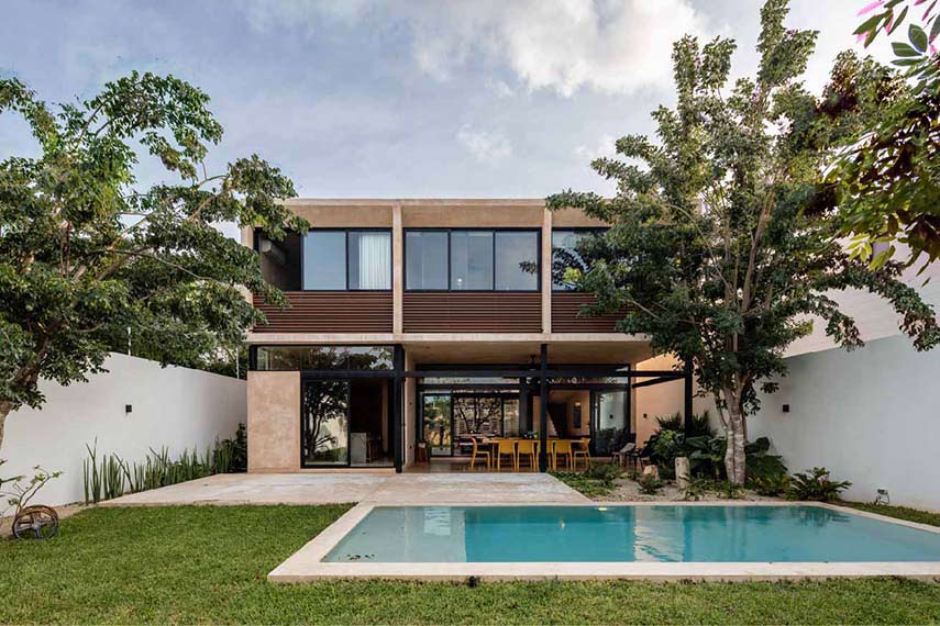 Casa Terral is one of the architectural projects by the Mexican studio P11 Arquitectos and, in its combination of functionality with aesthetics and environmental sustainability, embodies the essence of contemporary Yucatecan architecture. The geometric composition of the exteriors is marked by the encounter of materials: the horizontal gesture in aluminum slats marks the lowest level; intersecting it, a parallelepiped in stone from the foundation excavation of the villa itself; above it, a massive volume treated with traditional Chukum plaster mixed with Kankab, the red earth of the peninsula; finally, the perforated solid resembling a lattice that indelibly characterizes the villa's identity