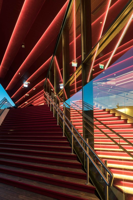 Una larga scalinata, che costituisce un elemento rilevante sia negli interni che negli esterni, guida il pubblico dall’entrata principale verso tutte le aree pubbliche organizzate nei piani superiori. In occasione degli eventi di maggiore importanza, le scale aiutano anche a distribuire il pubblico sui diversi livelli dalla sala di sotto, senza tuttavia apparire vuote in occasione degli eventi minori.