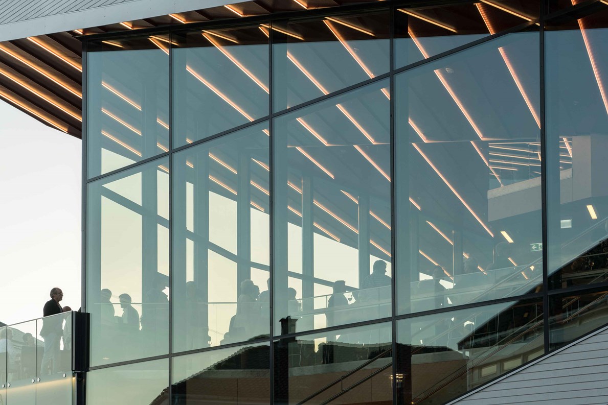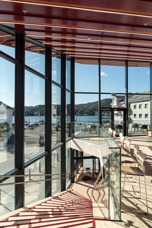 Punto chiave della progettazione è stata la facciata dell’edificio che da sulla grande piazza pubblica, gli architetti hanno voluto creare un collegamento fra lo spazio interno e quello esterno, eliminando il più possibile le barriere visive. Ed è qui che entra in gioco Wicona che ha installato più di 200 m2 di WICTEC 50, in contrasto con lati dell’edificio che hanno invece delle piccole aperture che riprendono il tipico andamento delle facciate in quella zona, rivestite con pannelli di legno bianco.