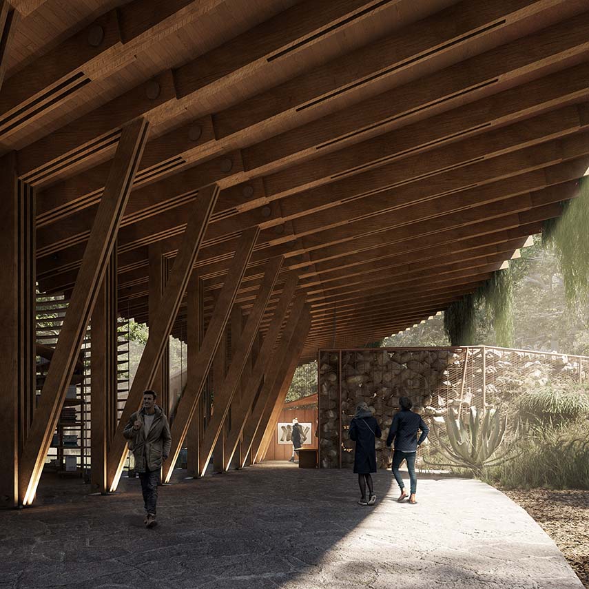 The architects from Vertebral studio design a discreet gesture for the Mexico City Environmental Culture Center that lifts the forest of Chapultepec Park over a long portico; this allows for the reforestation of the area and the development of the CCA below it at the same time. The geometry and layout of the Center, with its majestic wooden structures, allow for an organic flow through the park and, once inside, reveal Chapultepec at various levels
