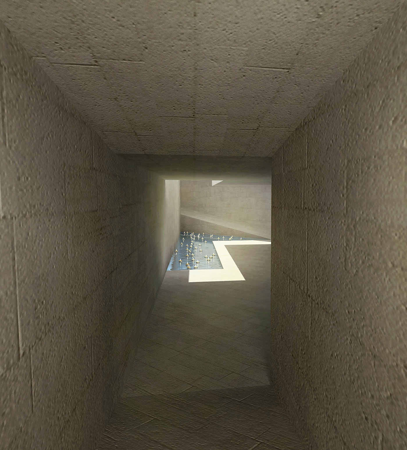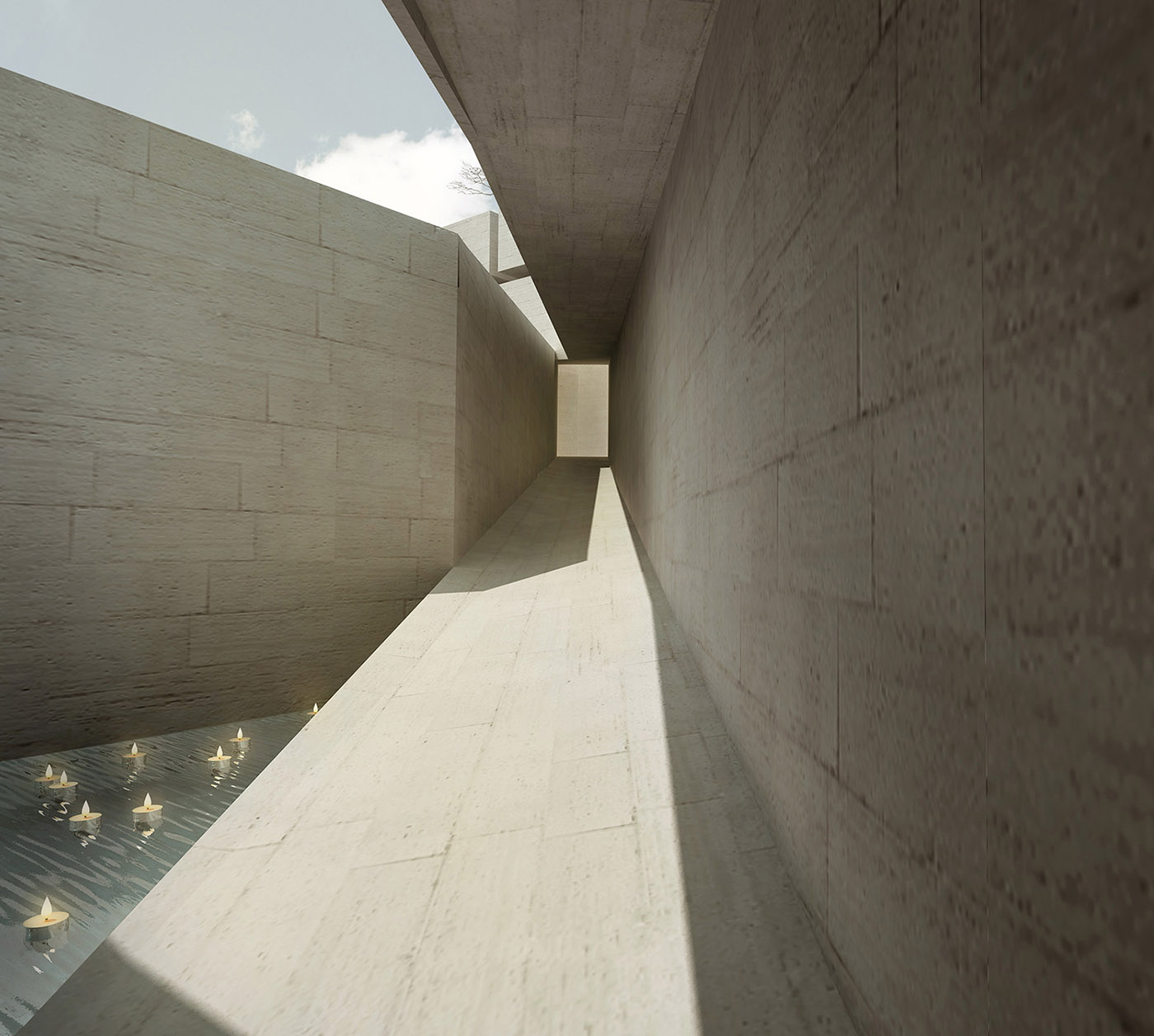 The chapel's exterior aesthetic, deviating from the image the public is accustomed to, changes the way the traditional structure meets both earth and sky. Visitors are given time to process this contrast between an unfamiliar exterior and a familiar interior as they pass through a descending, partially subterranean entrance space to a body of water that lies directly outside the entrance to the nave
