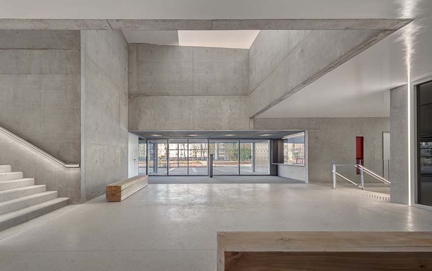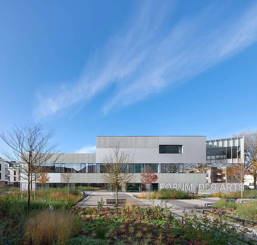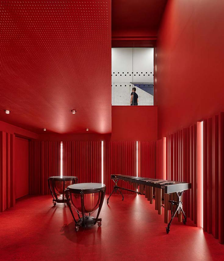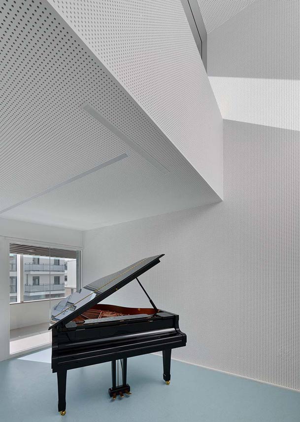 The architecture firm Dominique Coulon & associés designs the forms of the Charles Aznavour Conservatory as volumes that collide, reflecting the irregular geometry of the plot. The building faces south, taking advantage of the best view, and interfaces with the city with a striped vertical glass skin that captures light and at the same time clearly displays its interiors.