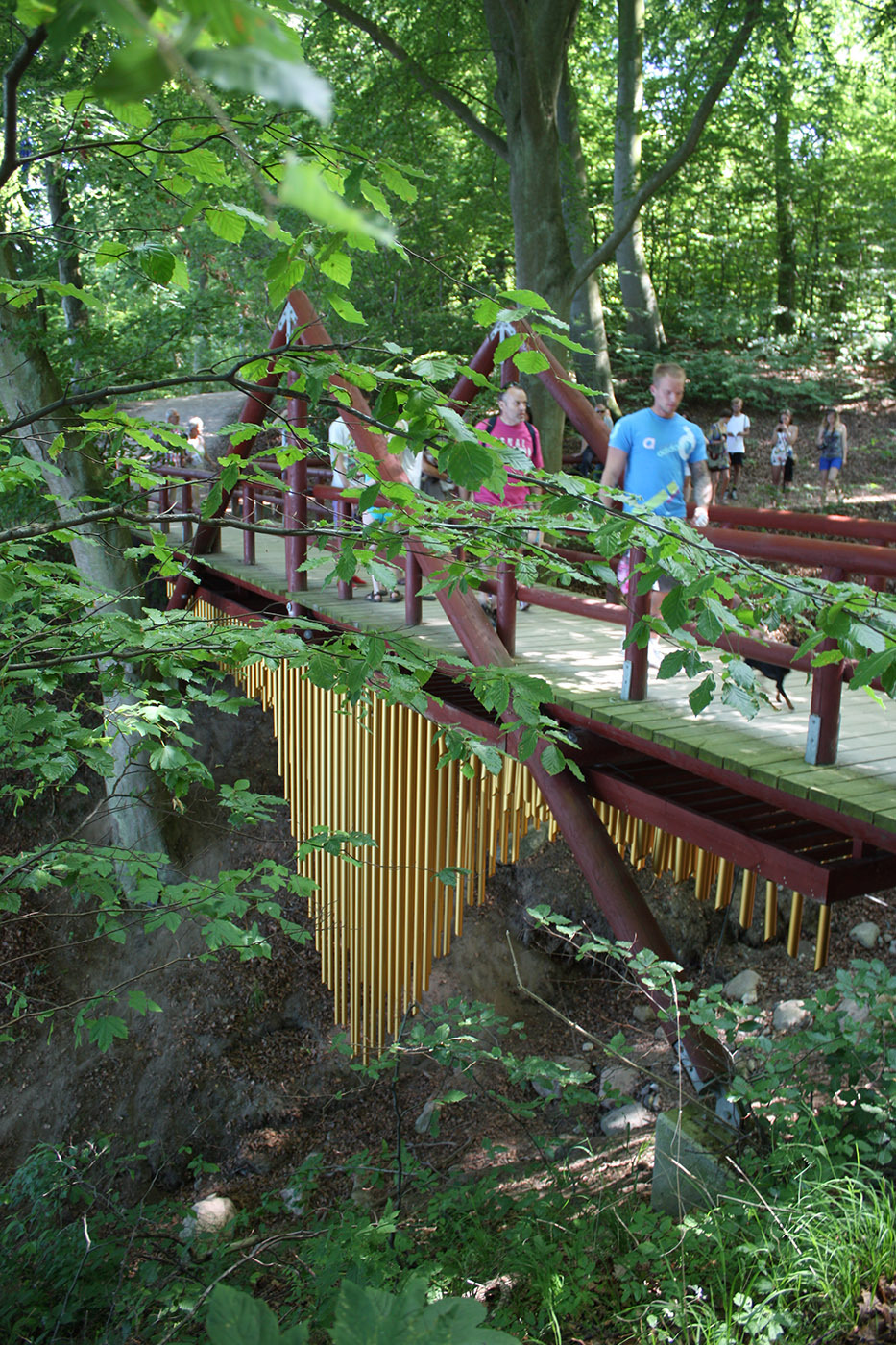 Mark Nixon of London-based studio Neon has transformed a bridge in Aarhus, Denmark, into a musical instrument by hanging metal tubes at the bottom. The musical bridge creates a surreal scenery accompanied by the sound that blends with the sounds of the forest