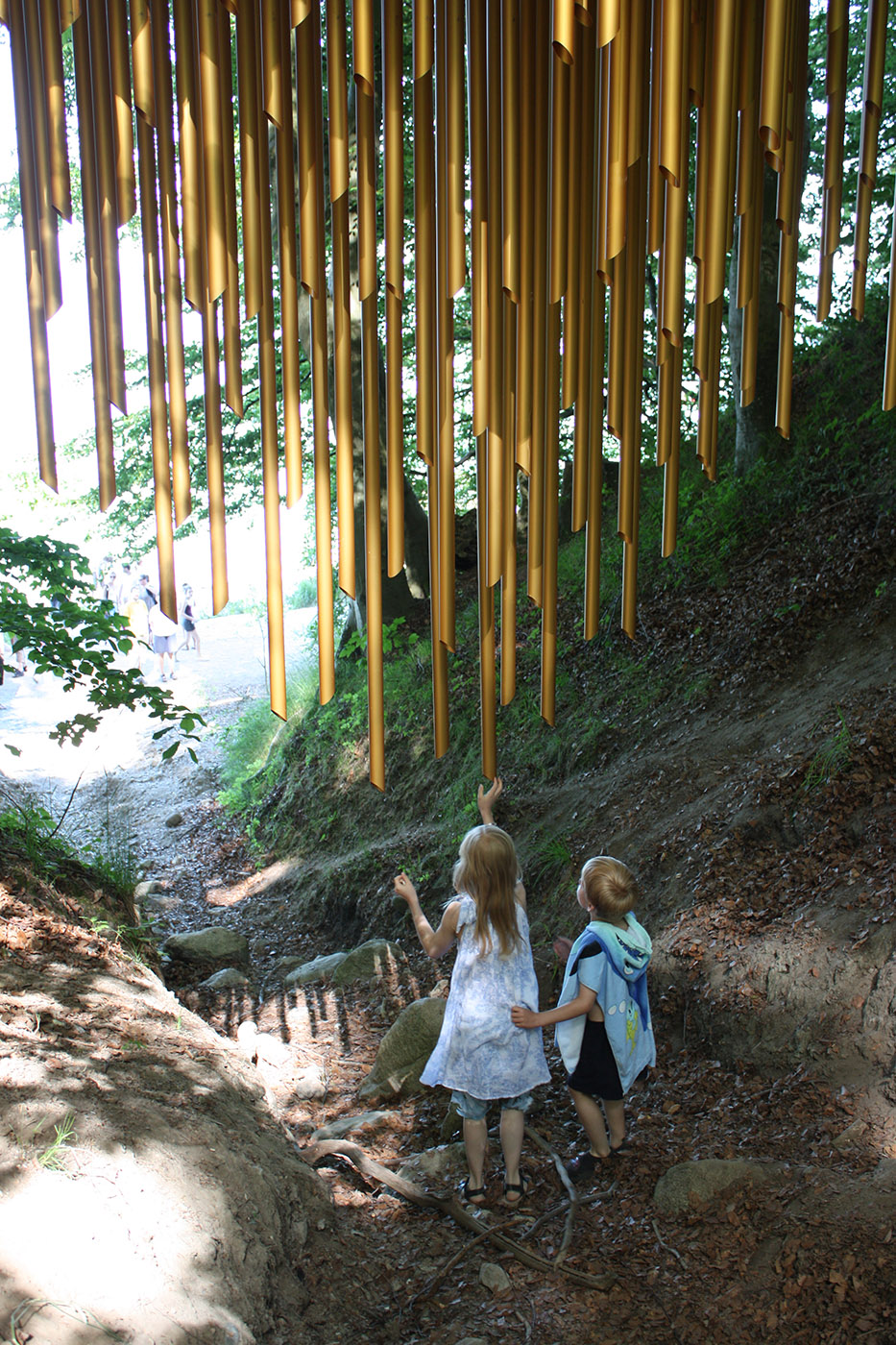 Chimecco is an interactive instrument that hides silently under the bridge in the forest until it is activated by human movements or the wind, making it sing, dance and play with the senses