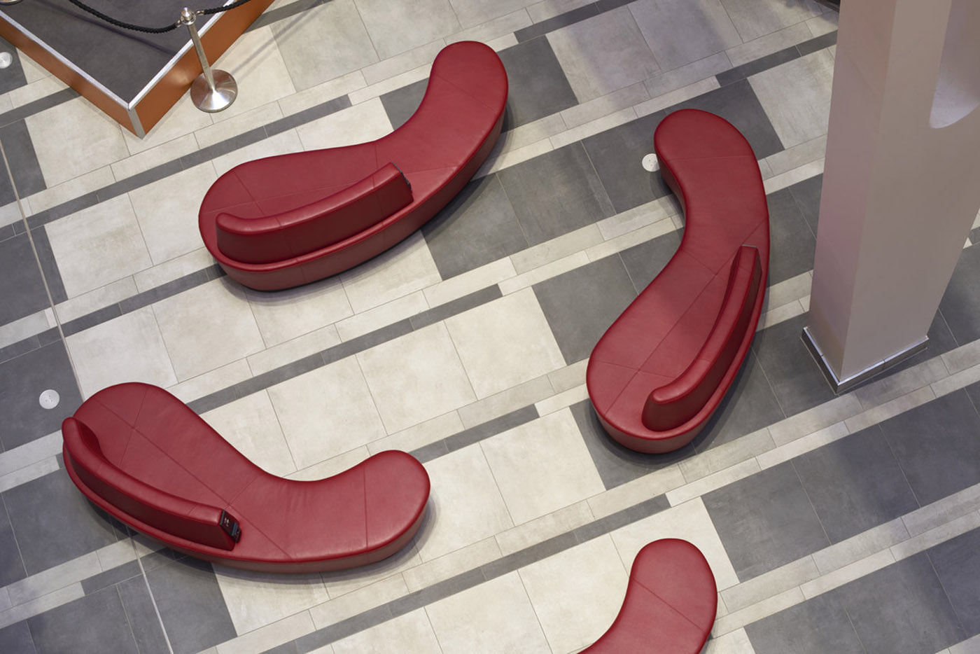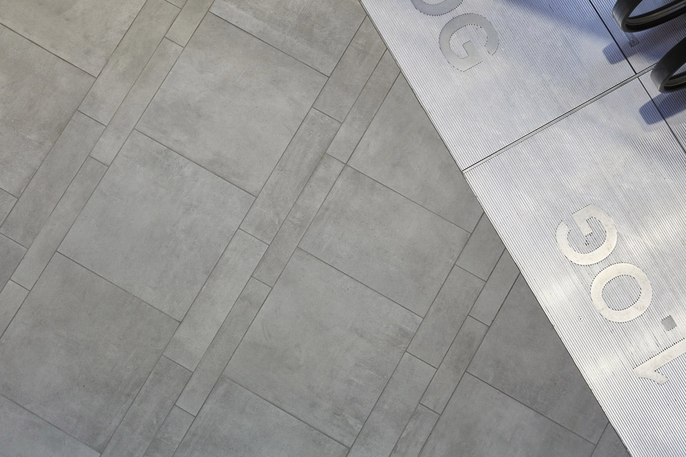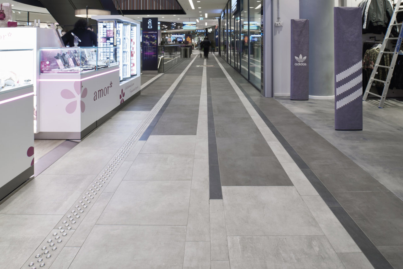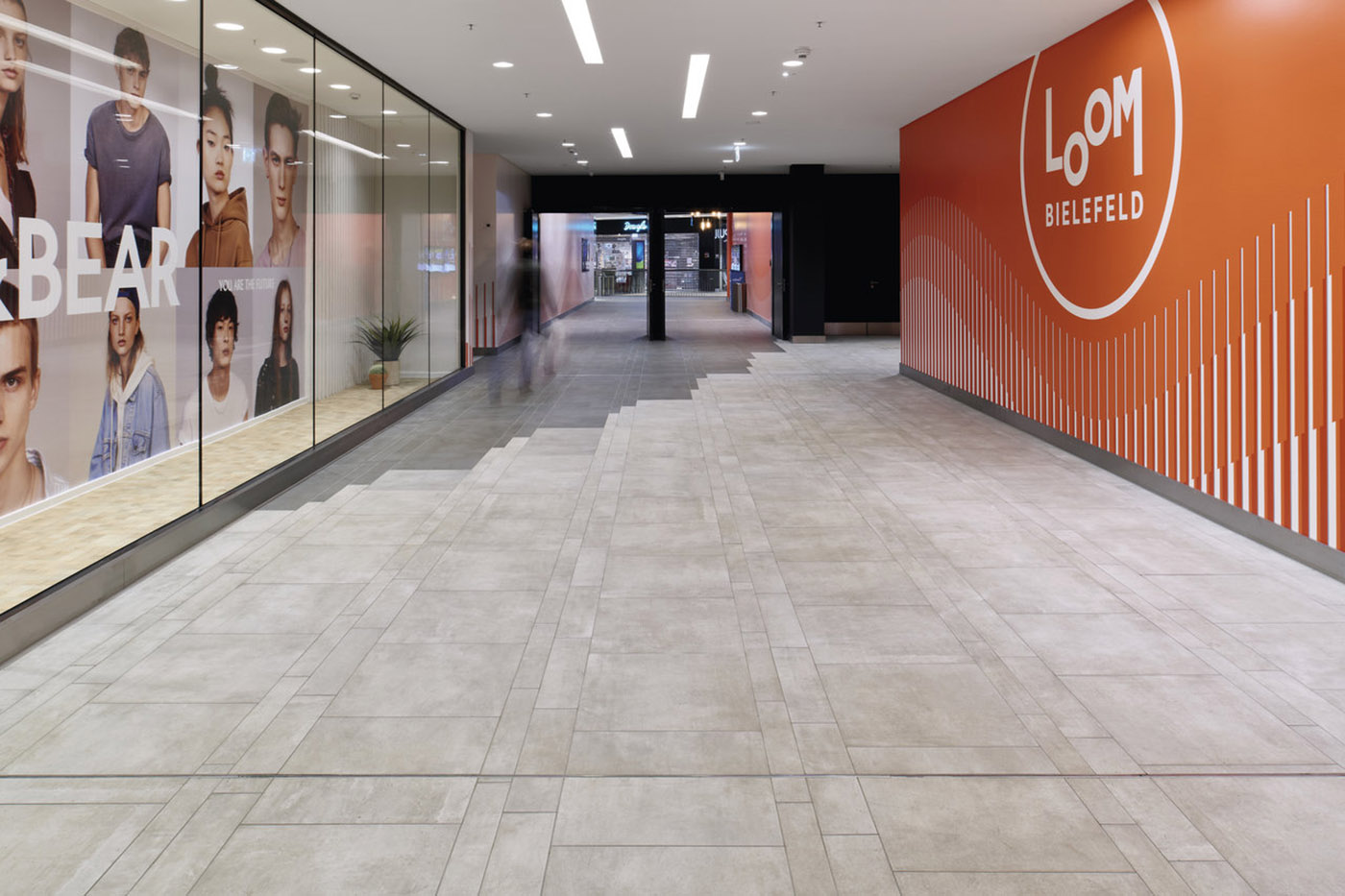 Lo studio di architettura export ECE Hamburg ha deciso di utilizzare la serie di gres porcellanato "Urban" del produttore di piastrelle tedesco Porcelaingres, con radici italiane, su un'area di 5.500 metri quadrati. Per il progetto di Bielefeld, è stato usato il formato 60 × 60 cm della collezione nei colori Urban Dove, Urban Grey e Urban Ivory.