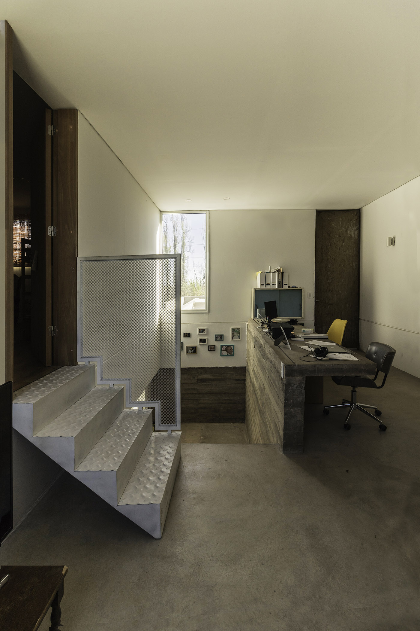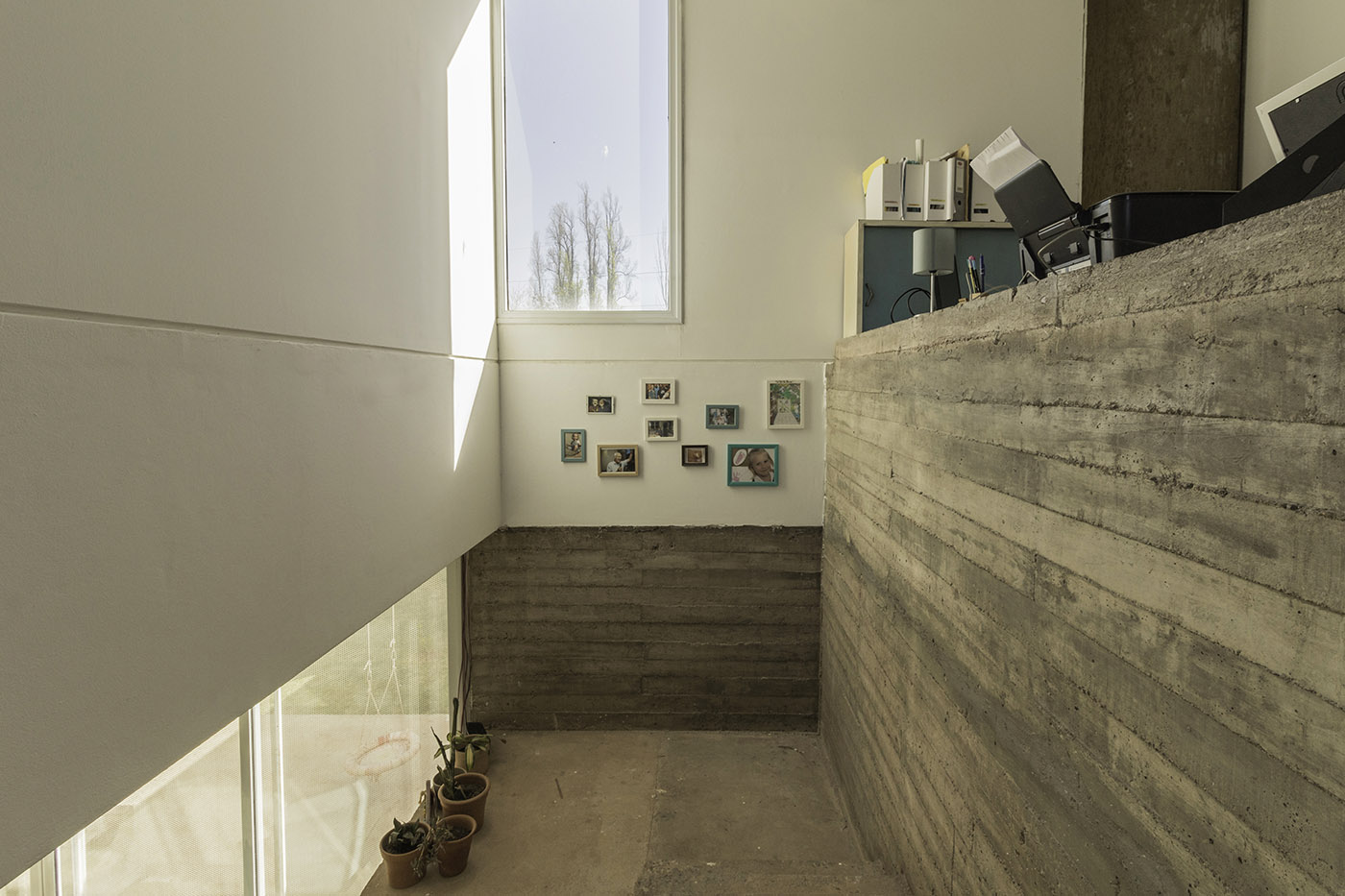 The choice of materials is based on two different premises depending on the level: the reinforced concrete second floor with exposed finish and masonry walls, and the metal frame second floor clad in corrugated metal sheeting