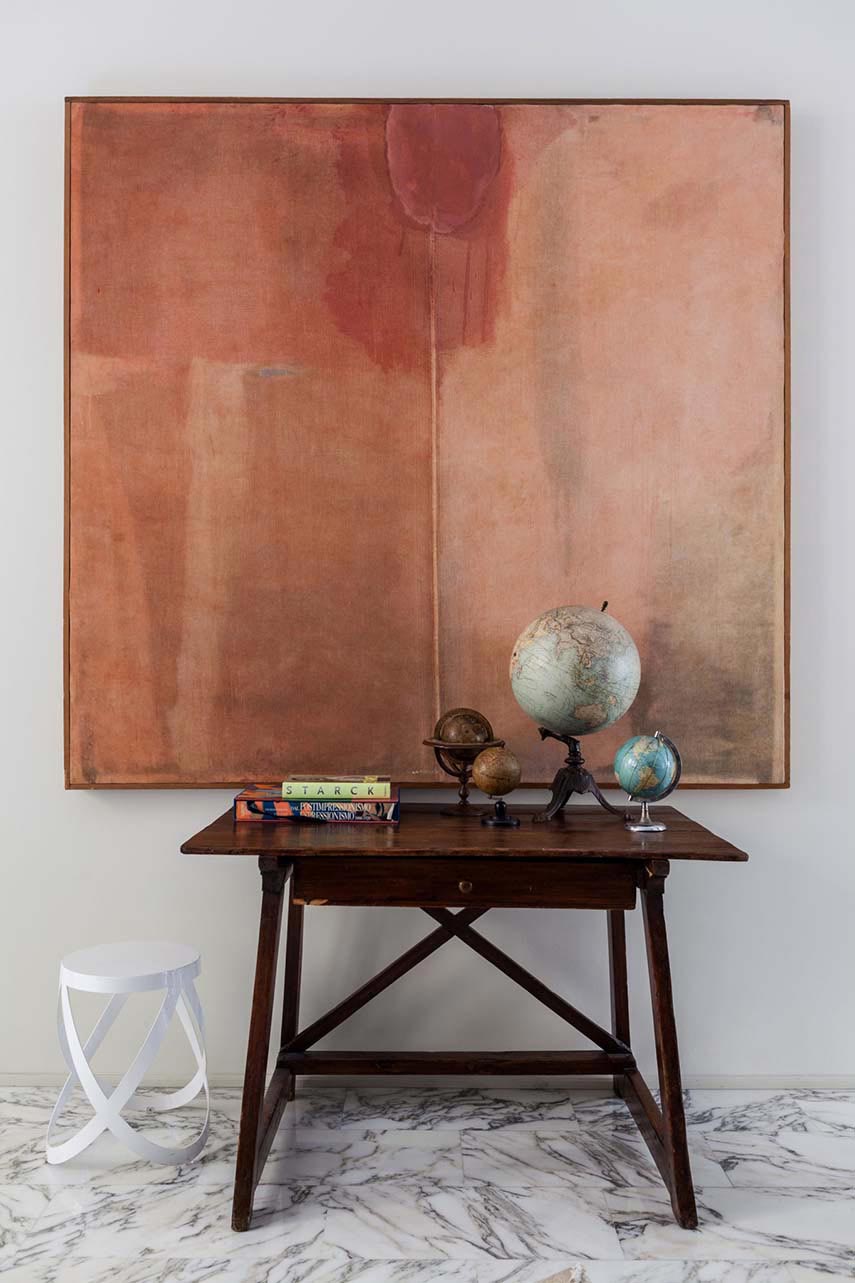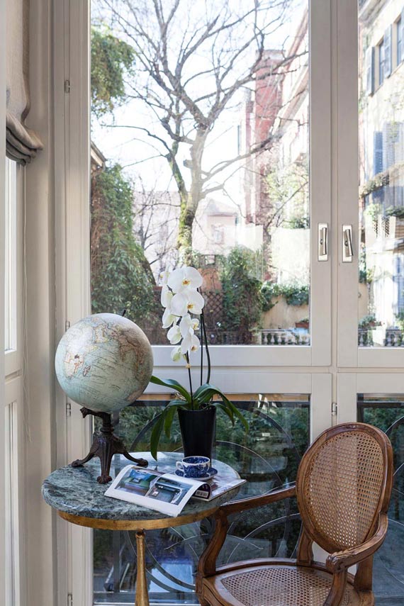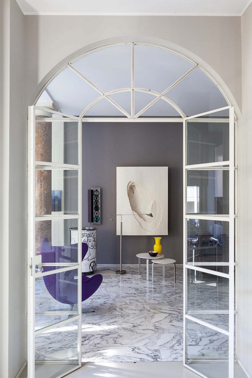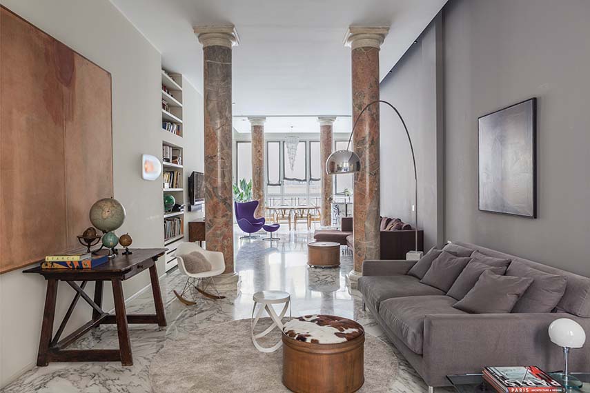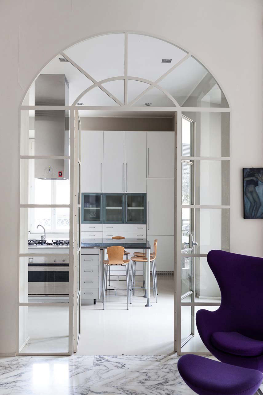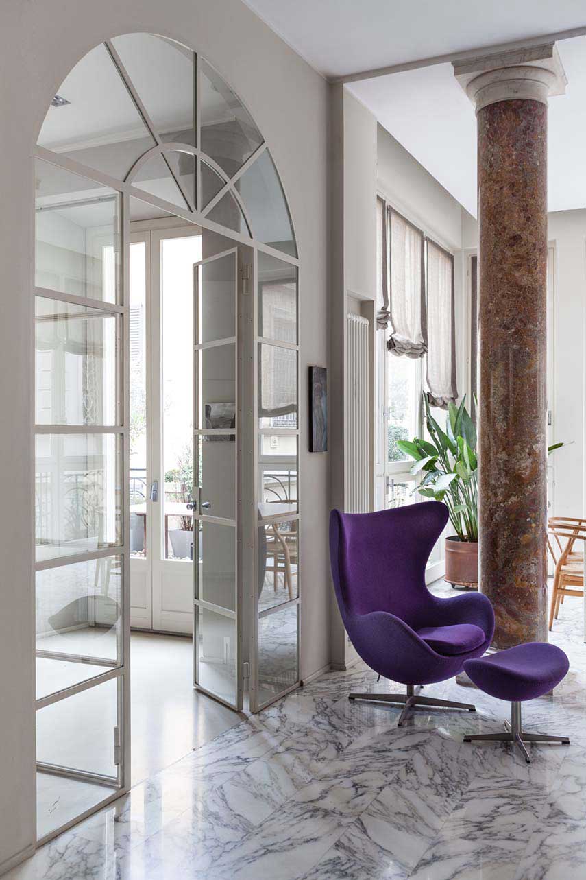 Surely in one of her most heartfelt interior design projects, Francesca Cutini personally takes care of her Architect's House thinking of the perfect definition for this Milanese space made exclusive by the precious finishes, the double pair of columns, the large bow-window and the terrace: "the discreet charm of the bourgeoisie". Initially tempted to lighten the aesthetics by painting the Red Verona marble columns white and creating a resin floor instead of Carrara marble, she then decides to maintain the original style