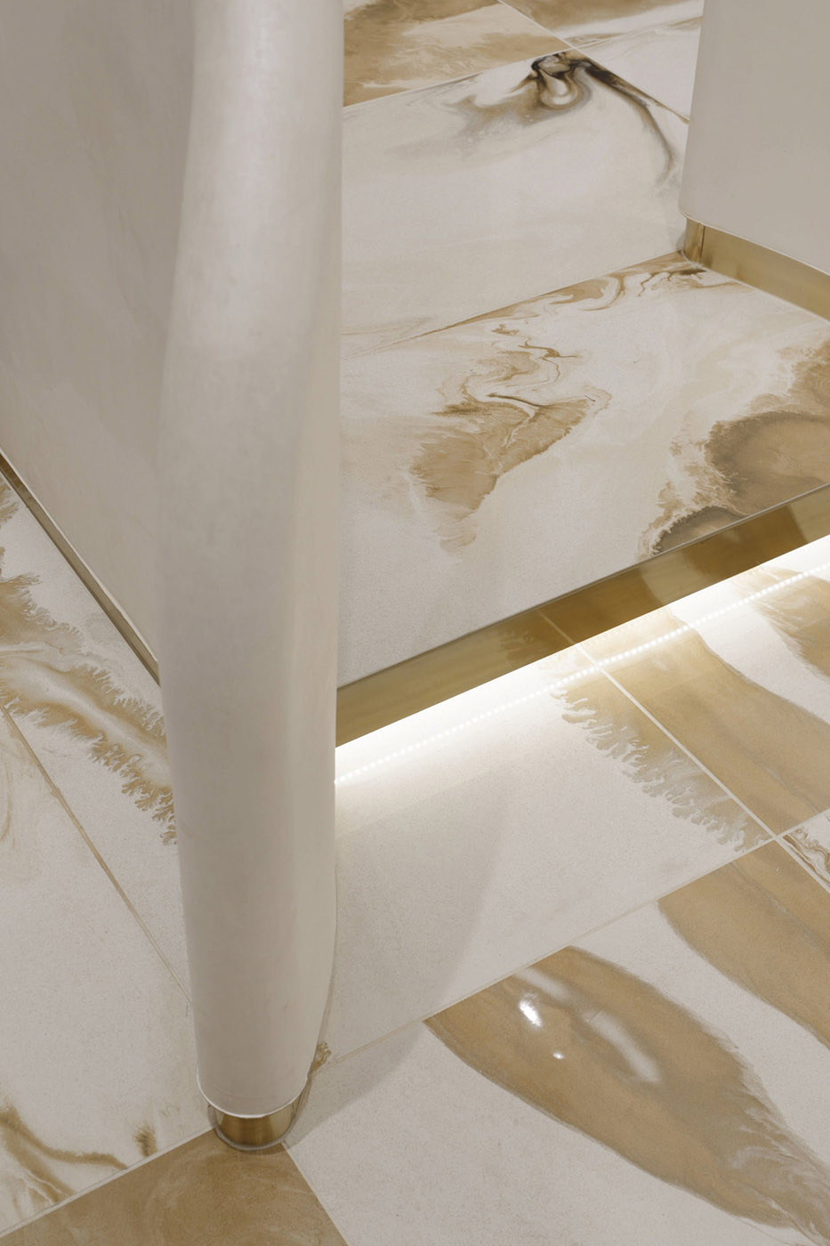 The reception room, as a space of serene, pleasant waiting, has been wrapped by Cosmic Marble Lune tiles, which, thanks to the seamless continuity of a precious texture, exalt theessence and aesthetics of the design, adding a touch of superb elegance in accordance with the exquisite refinement of the polished brass which becomes alive under the light with its multiple reflections.