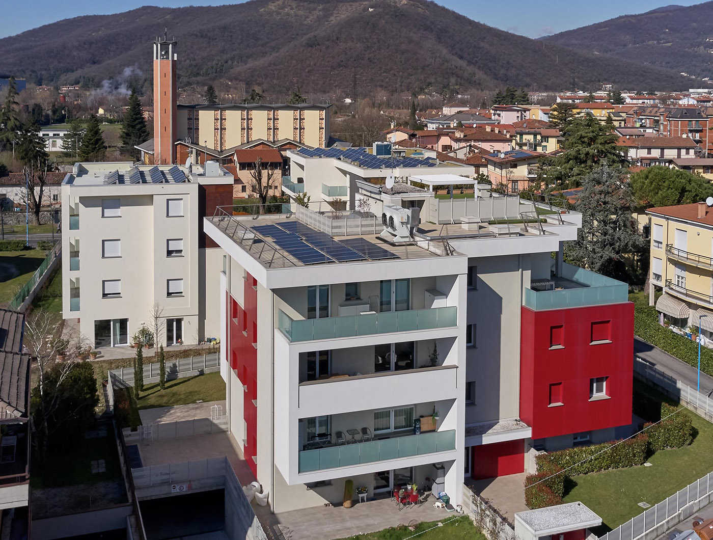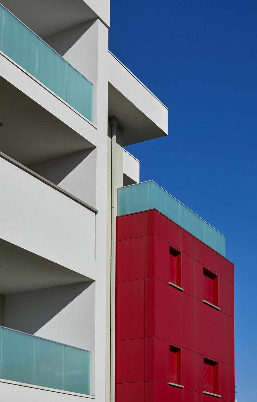 Complesso residenziale a Brescia. Volumi architettonici puri enfatizzati dal colore e dall’essenzialità del vetro