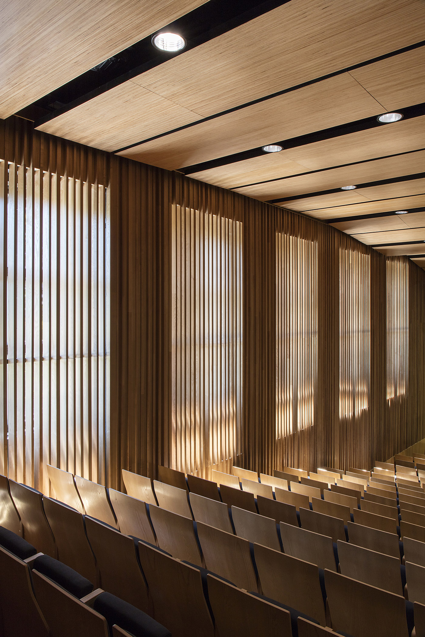 The designers from the team of Robert Gutowski Architects paid particular attention to combining the Concert Hall with the existing buildings. Sophisticated and detailed wood panelling creates friendly and sympathetic spaces; natural and non-natural light plays an important role, filtered by louvres on the south-facing walls. The medieval wall fragment found during the deepening of the hall is visible through a floor-to-ceiling window