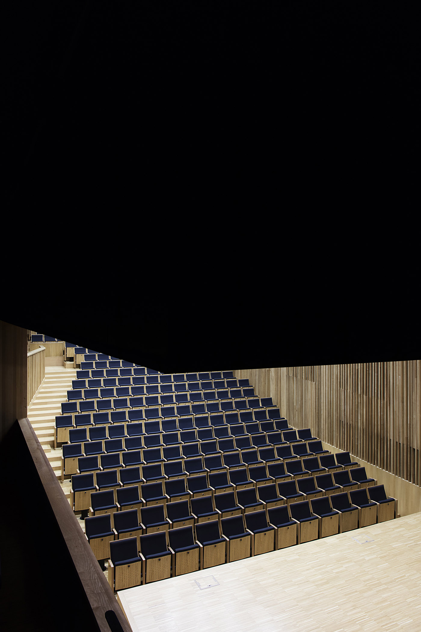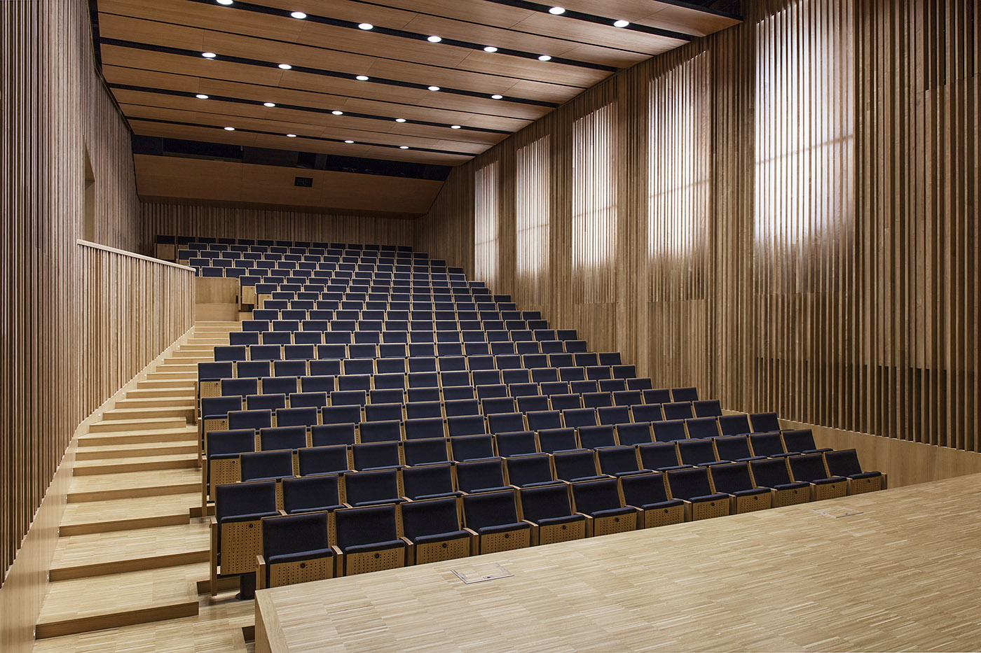 The single-level composition of the stage was thus created to provide a harmonious acoustic environment for the performers. The floors are made of oak. Technical facilities, professional lighting, audio and audio-visual systems, and a digital cinema add further opportunities to use the hall, and the air-conditioned environment in summer as well as the 268 unique seats all provide adequate comfort. An additional 132 seats were built on the gallery around the stage