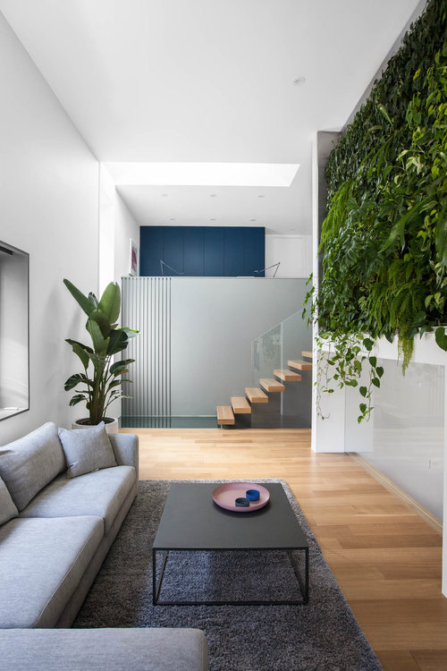 A new wall is created in the middle of the house, a "green" wall made of numerous plants that acts as a central element. With a height of 2.8 x 5 metres, the screen divides two living areas on two levels to form a double-height space. Set in a white frame, the green is raised above the ground floor to provide space for the window below with a view of the two living areas