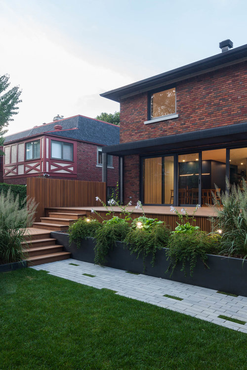 Part of the masonry rear wall is removed and a steel support beam added. The metalworking now forms a canopy above the terrace covered with red cedar. Above the large opening, the two windows in each of the children's bedrooms on the first floor were replaced with a window