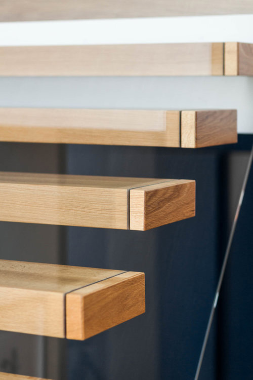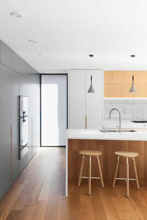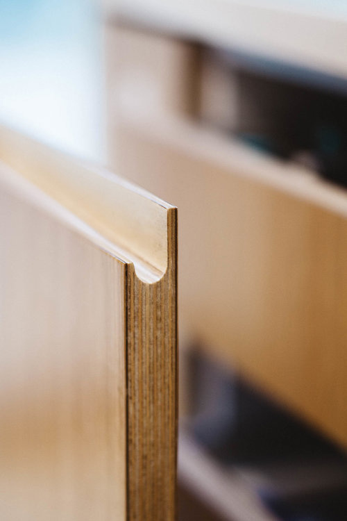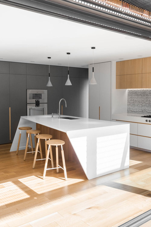 The kitchen furniture made from Russian plywood is covered in grey and white laminate. The glass splash guard running along the worktop is embossed with a piece of music chosen by the clients. For lunch, you can choose between a white quartz corner top, which wraps around the kitchen island to form a bar area for a quick snack or a wooden dining table
