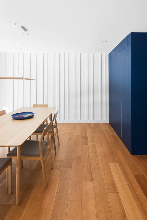 Residential renovation in Montreal.Color contrasts for minimal furniture