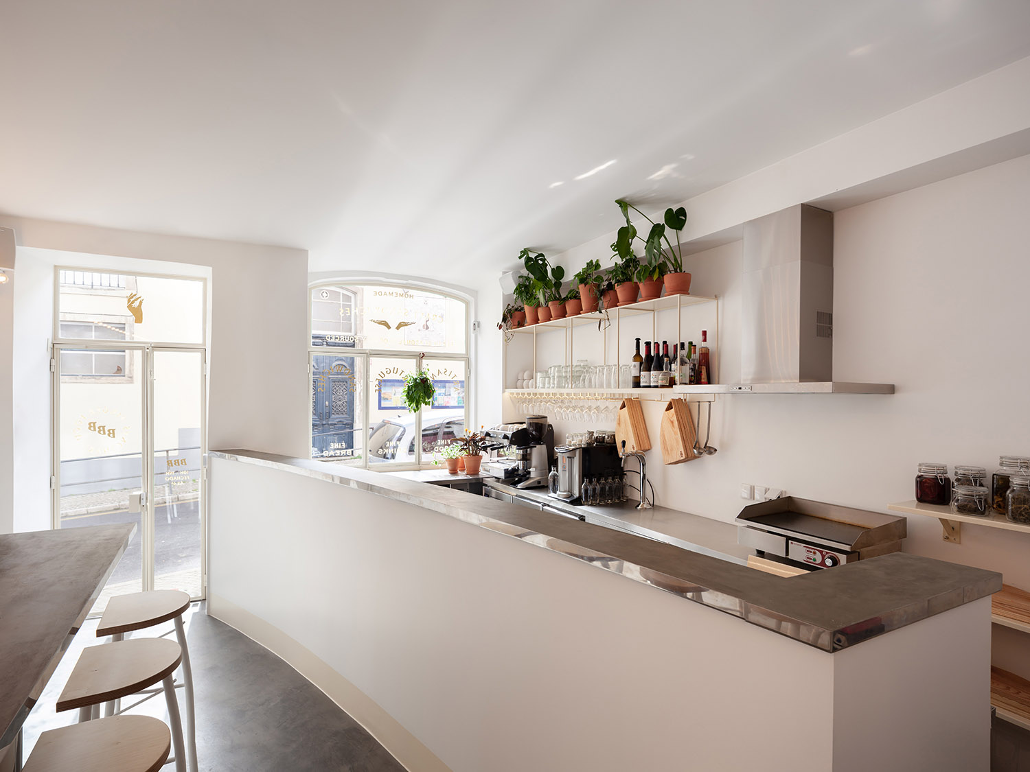 Thanks to the use of arches, two different interior spaces are divided. A long table runs through the whole space, creating a kind of continuity between the spaces. Custom-made stools adapt to the three different heights of the table