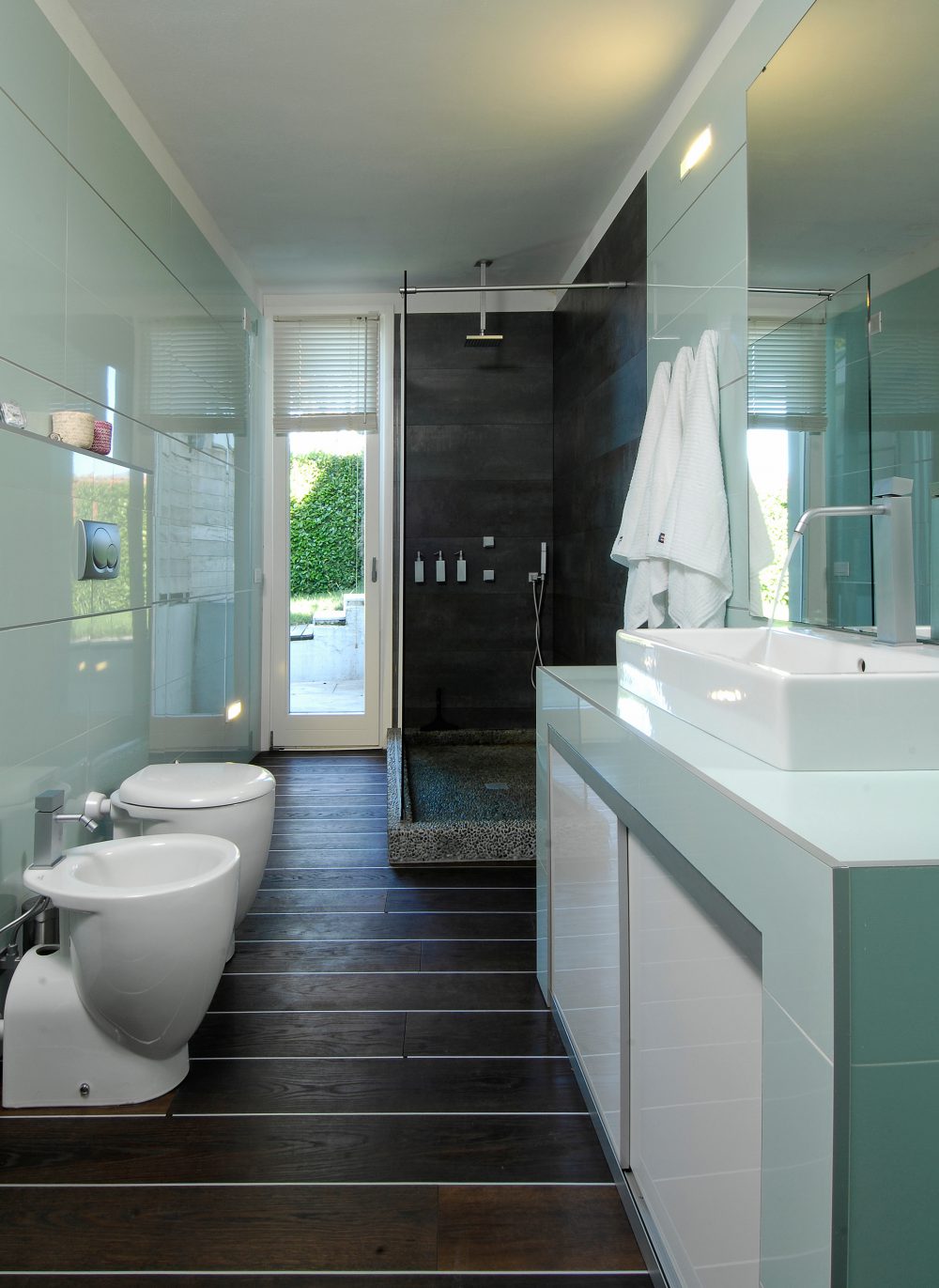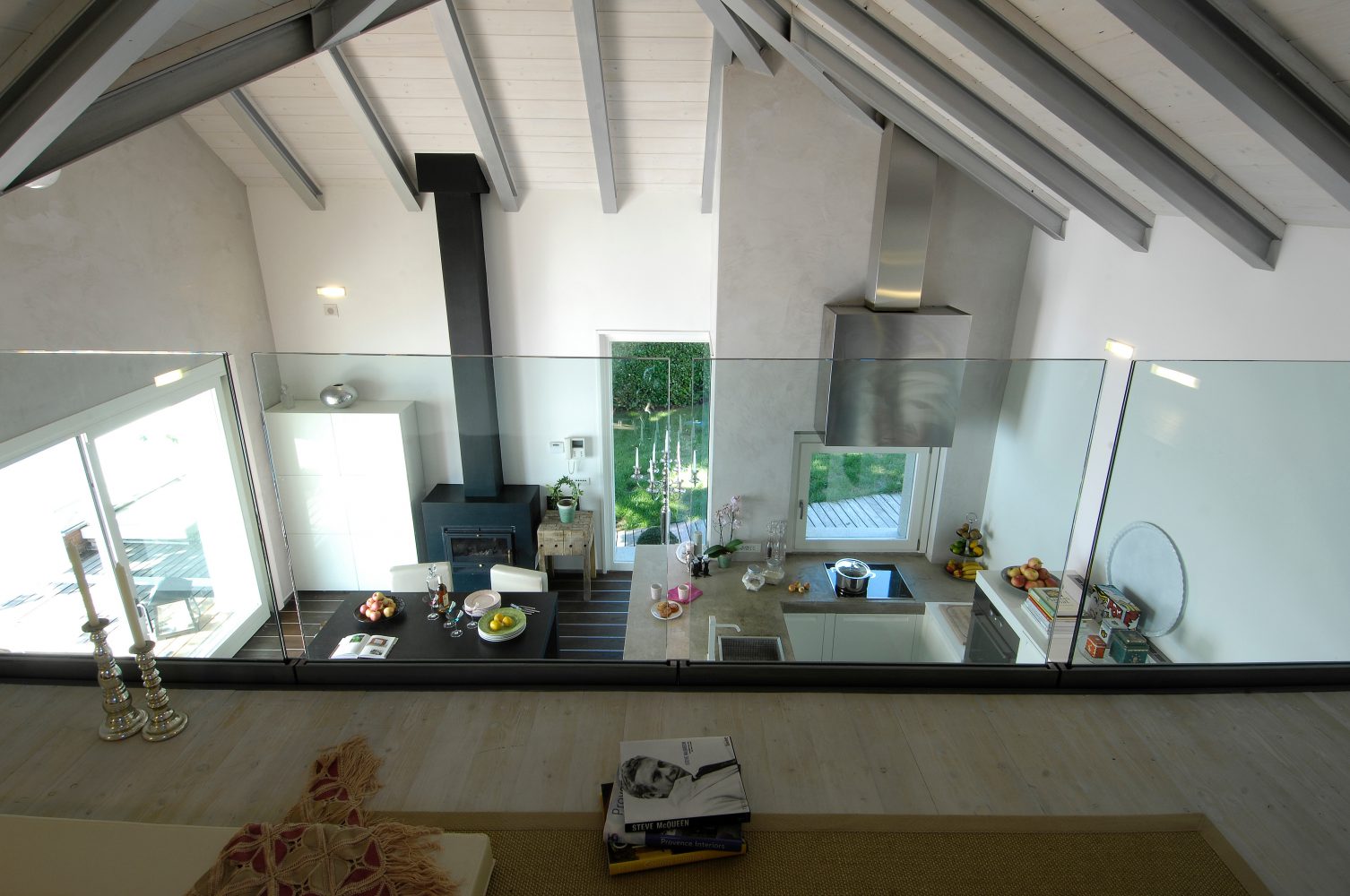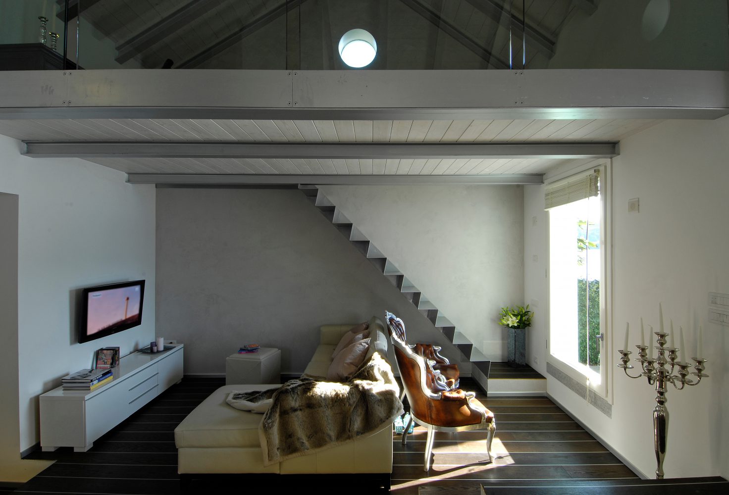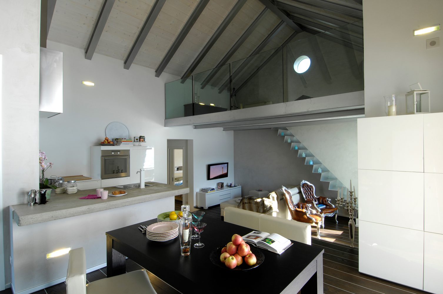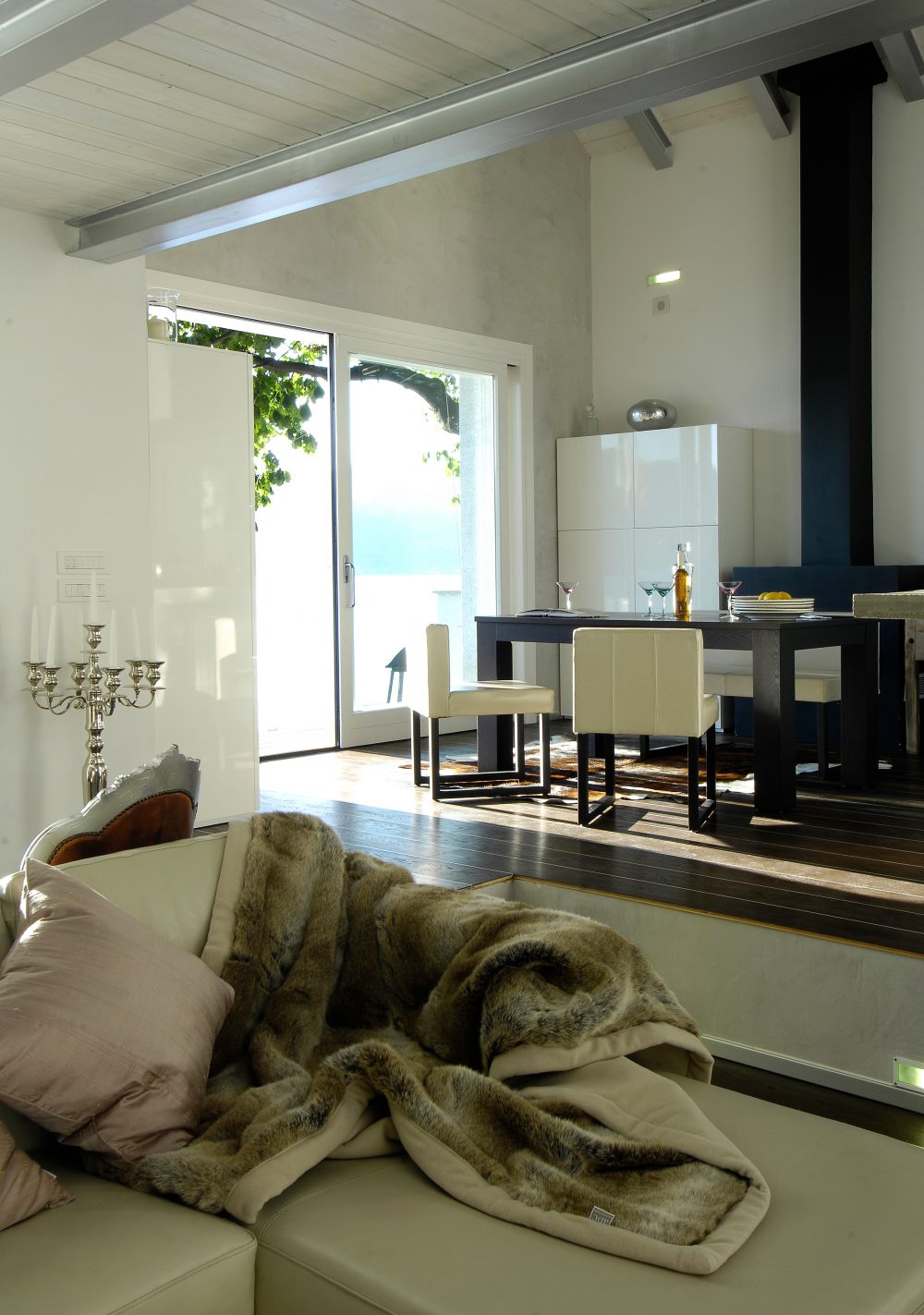The living area consists of an open space, where the kitchenette and dining area are separated from the living room by a few steps. Above the latter there is an iron and wood mezzanine which can be accessed through a light and simple staircase. The idea of the loft was born to create a space for relaxation related to reading, its balustrade was deliberately made of glass panels so as not to hide the view of the space below and the view of the lake. The sleeping area consists of a master bedroom with adjoining dressing room, a guest room and a bathroom. Even in the latter bathroom it was decided that soft colours should be used in contrast with darker tones. The blue and glossy ceramic that covers the walls contrasts with the rough black of the shower and the dark wood of the floor